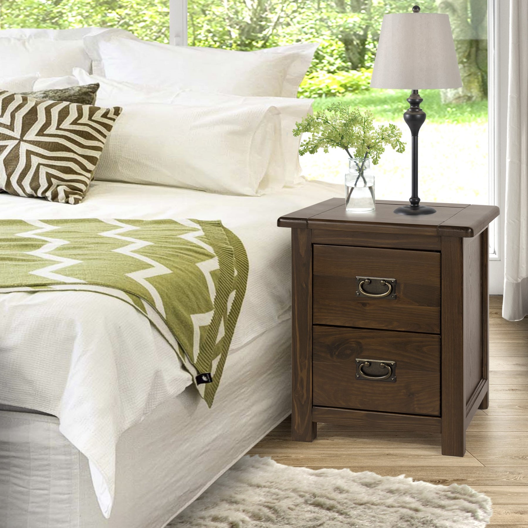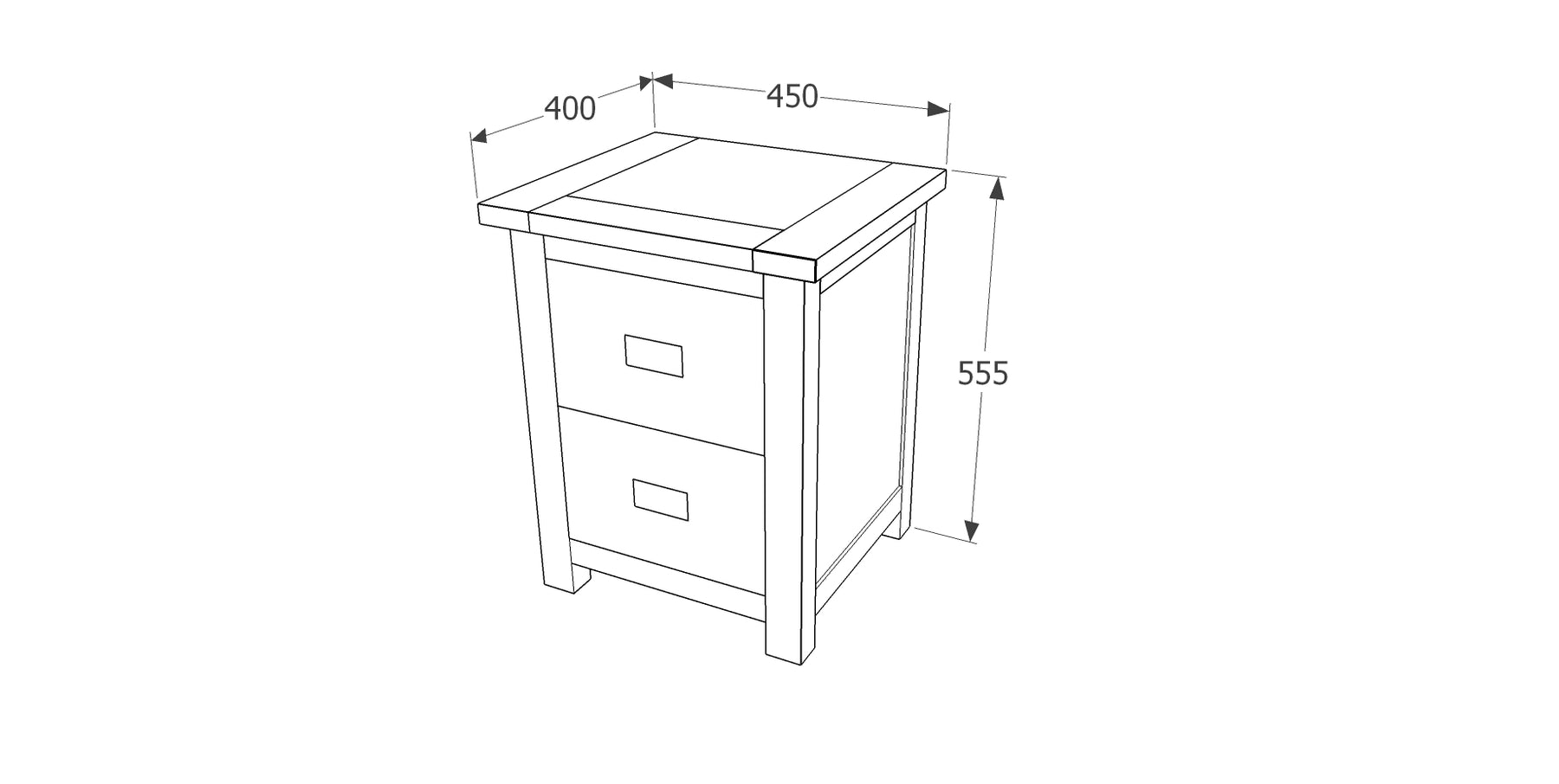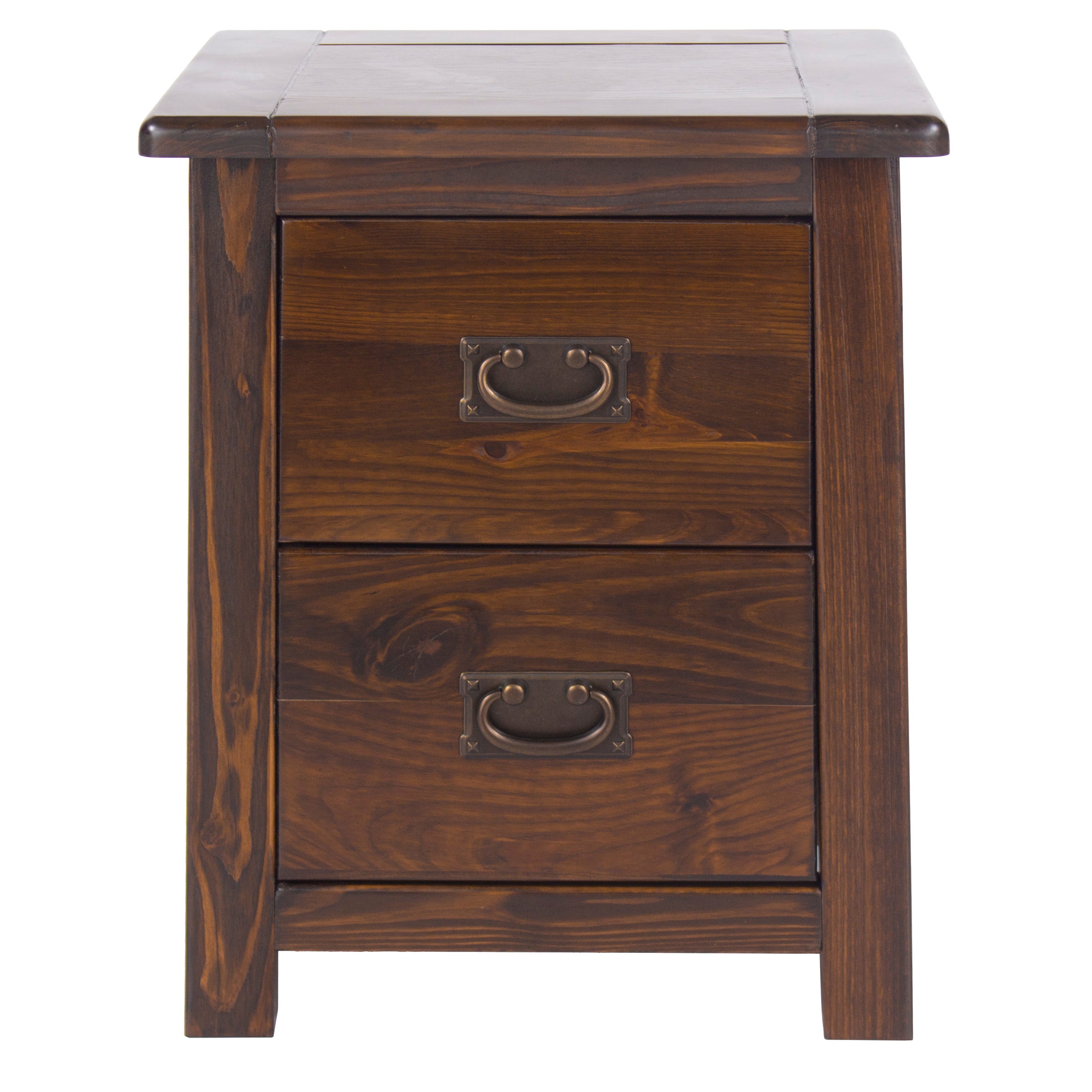 This handcrafted 2 drawer bedside combines different woods with a rich dark lacquer finish and real metal handles. W45 x D40 x H55 cm