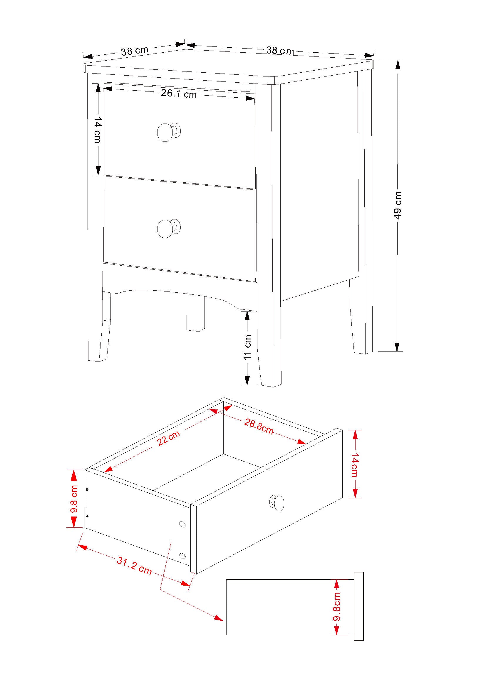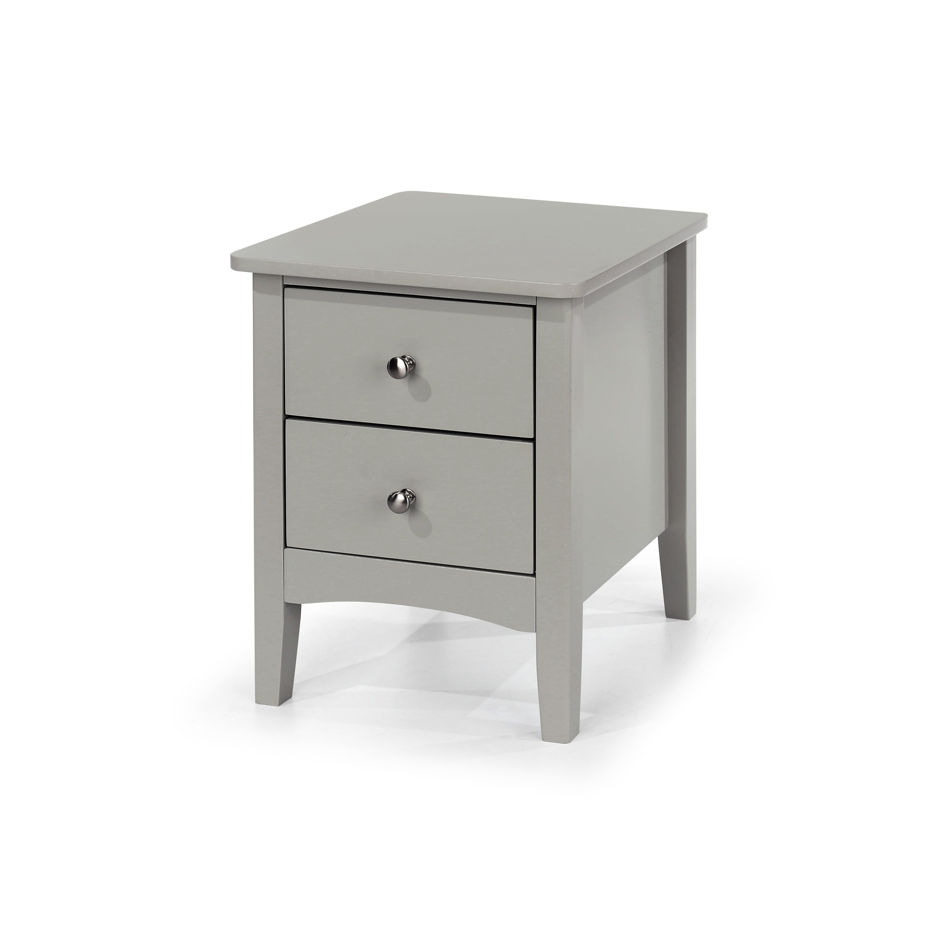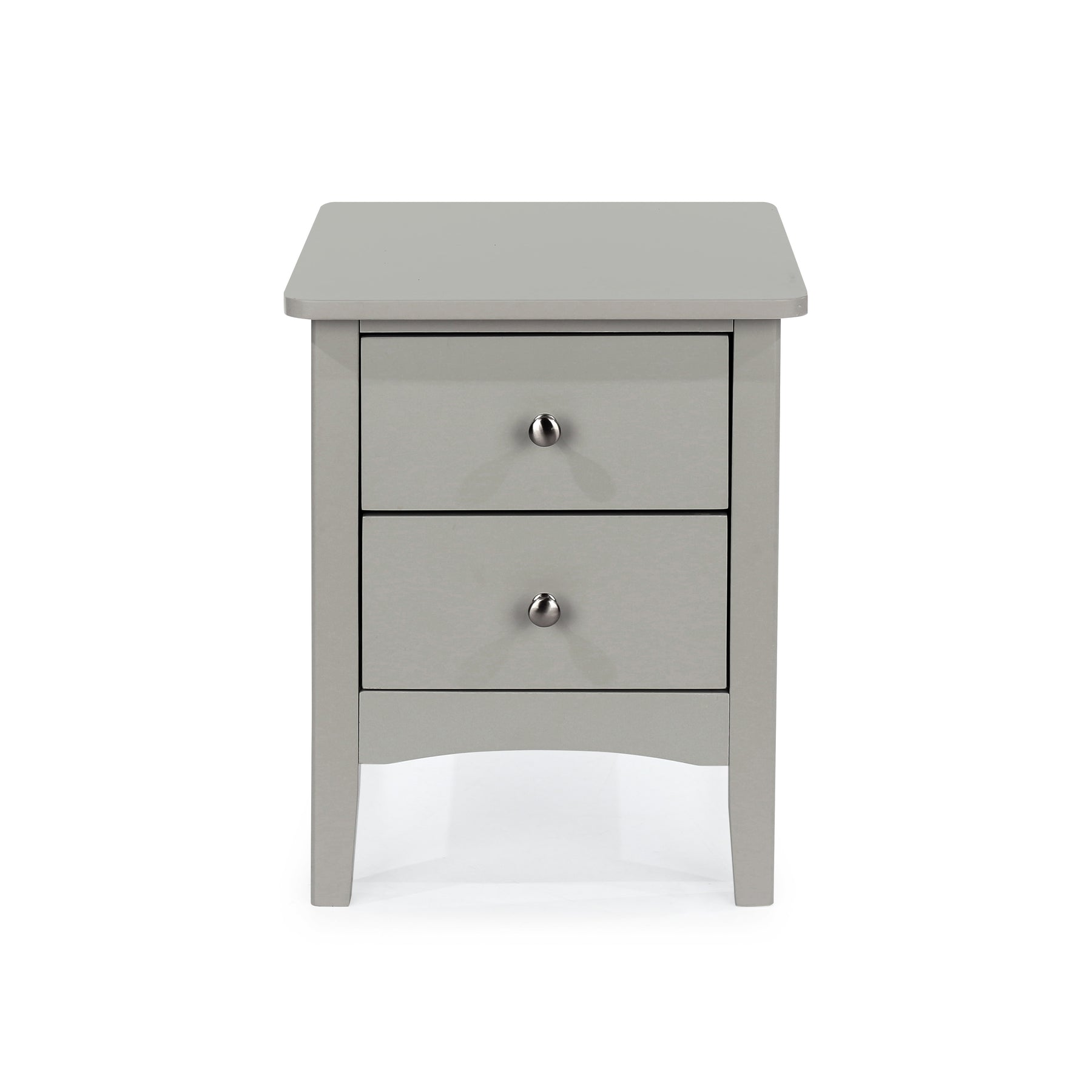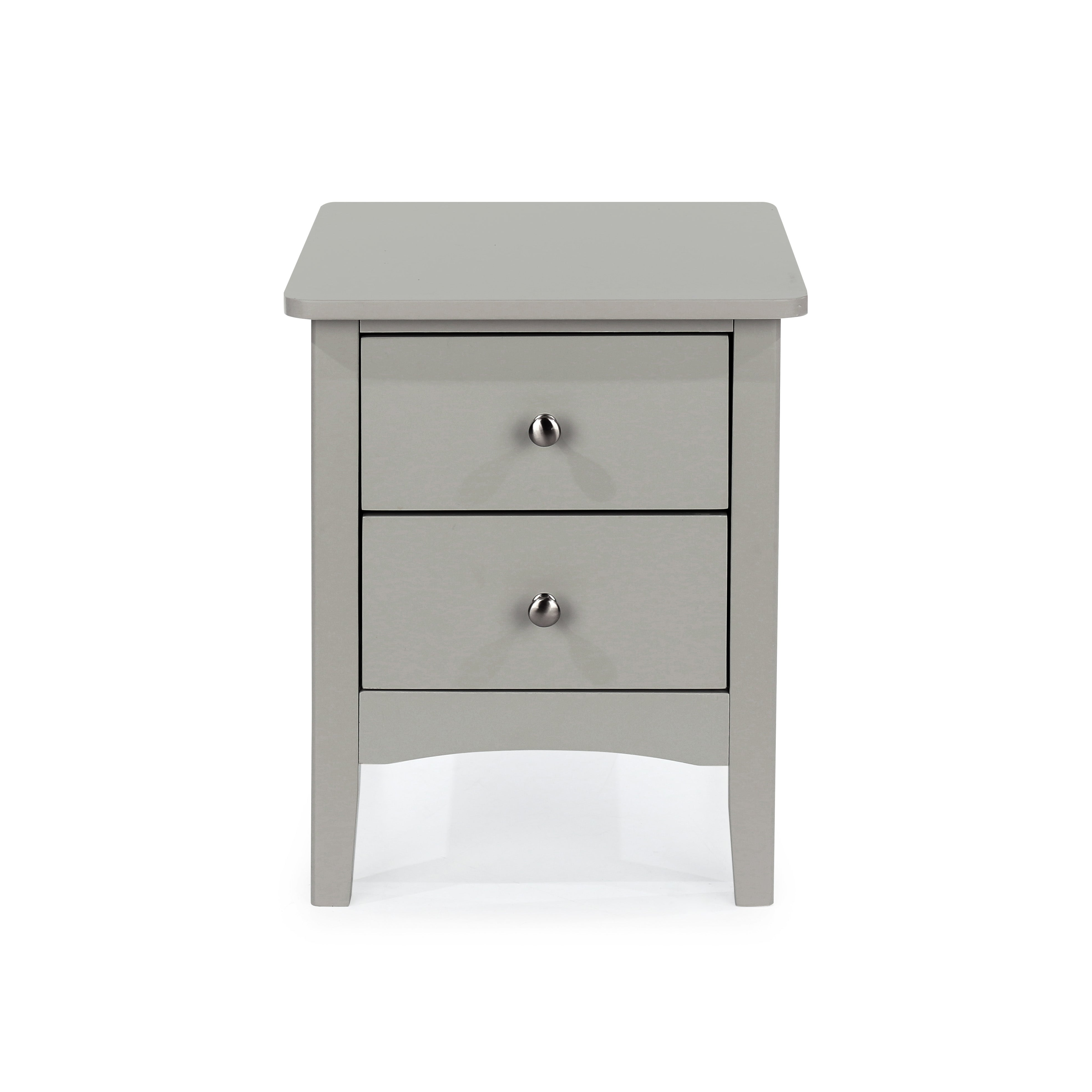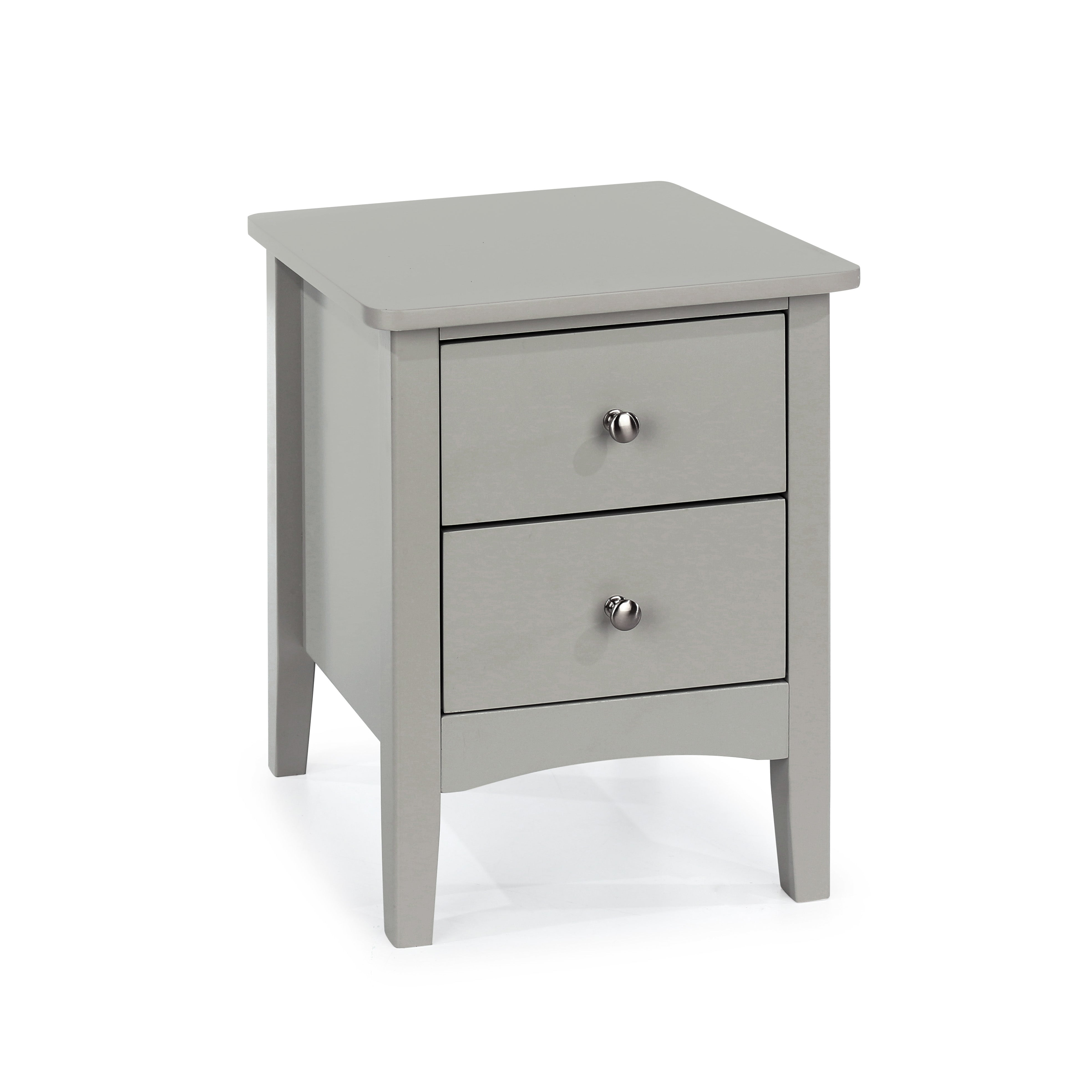 This petite 2 drawer bedside cabinet is ideal for small rooms, it features a soft grey paint finish, complimented with tapered legs, real metal handles and easy glide drawers W38 x D38 x H49 cm