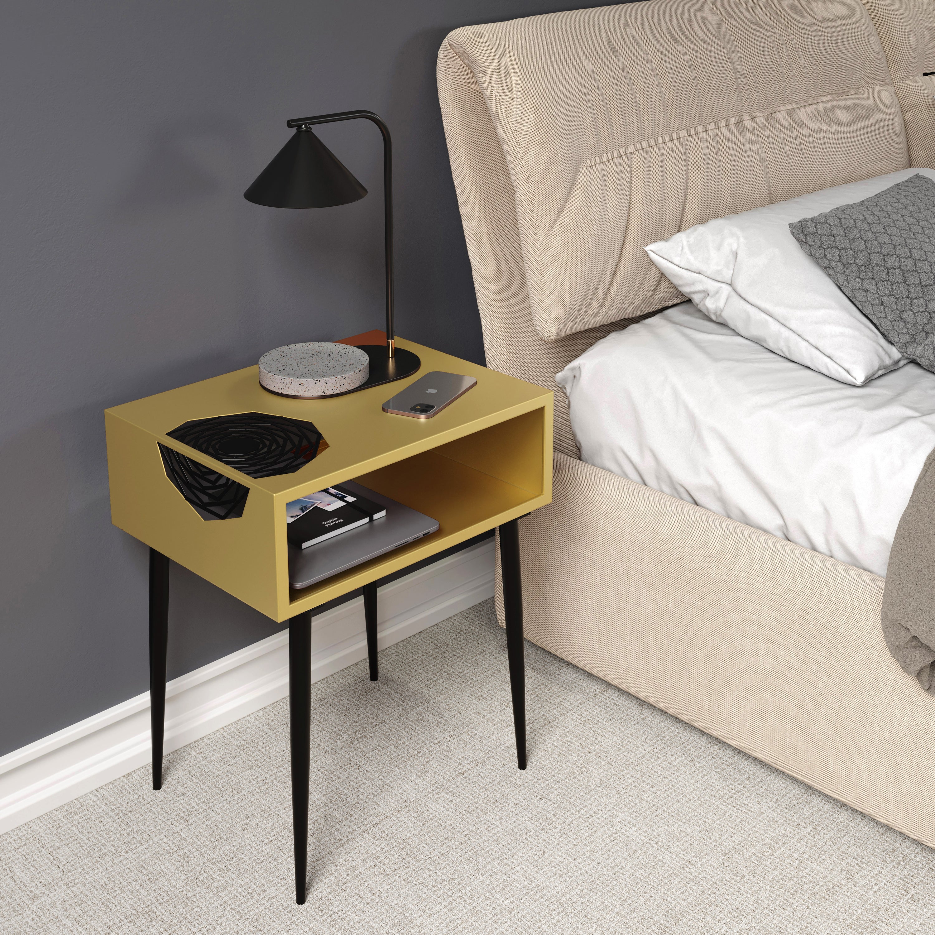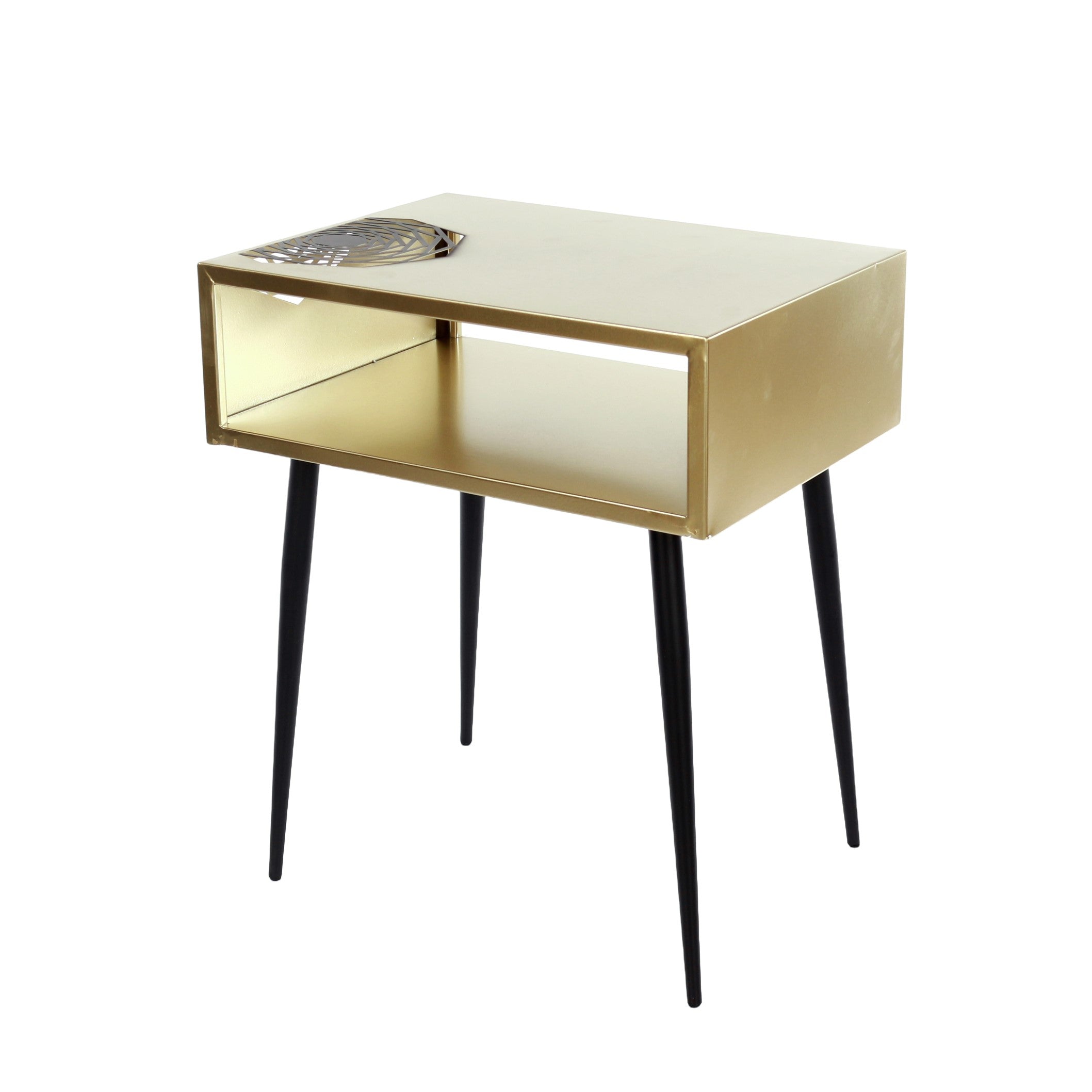 Add a touch of distinct elegence to your home with this stylish piece of metal furniture. Ideal for use anywhere in the home, as a bedside or a side table. Made entirely from metal with a gold paint finish with a distinctive laser cut geometric pattern which transverses the top and side, highlighted with black paint and tapered steel legs for extra impact. The rectangular cube design provides lots of storage space on top for a Lamp, books or pictures whilst the undershelf is ideal for storing bedroom essentials of magazines. This striking piece is sure to make an impact in your home. W46.2 x D35.8 x H55.6 cm