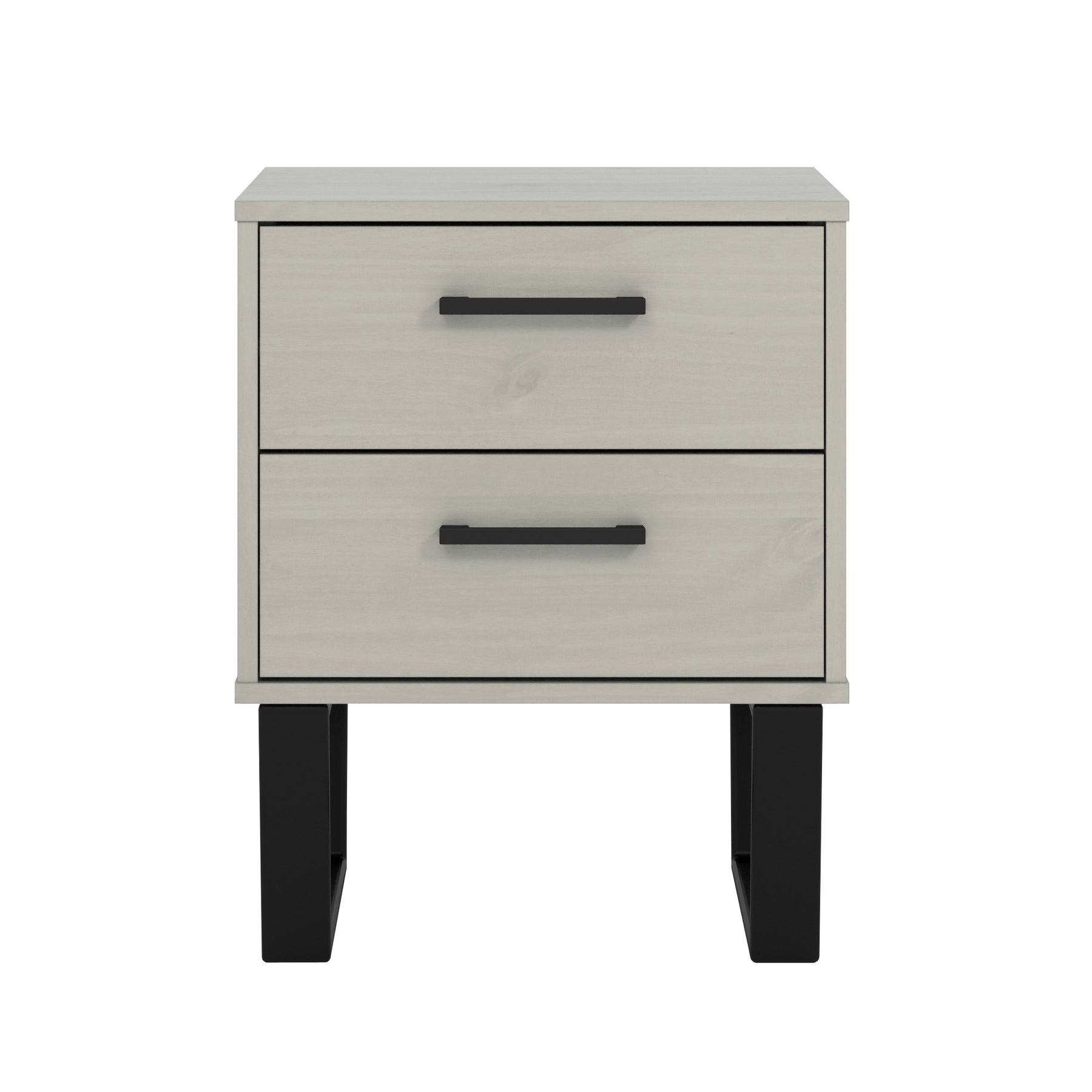 Our industrial look bedside cabinet combines real wood in an attractive grey wax finish with black pull handles and metal underframe. W45 x D39.5 x H57 cm