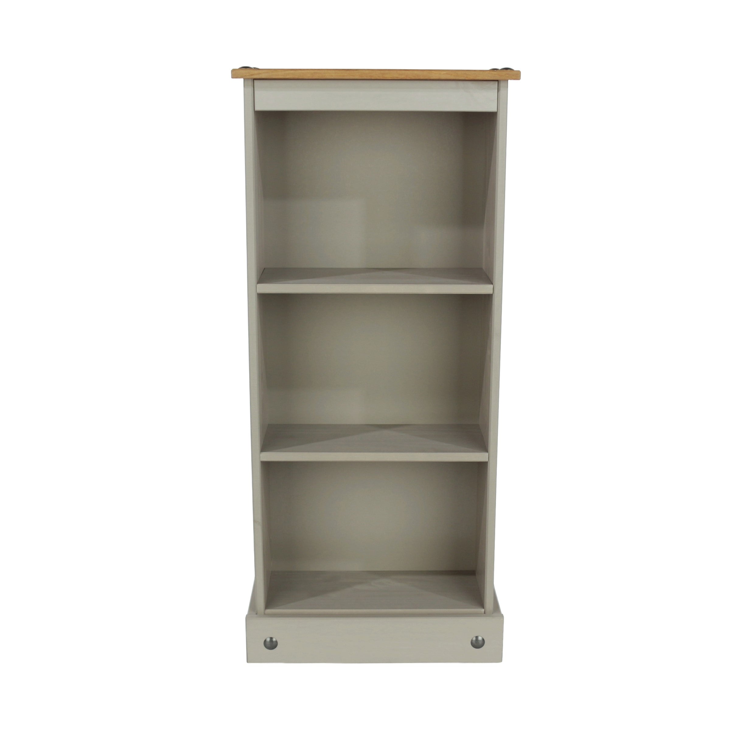 Short of space, this low narrow bookcase is an ideal choice with adjustable shelves, finished in grey wax with a antique effect wax top. W46 x D20 x H103.6 cm
