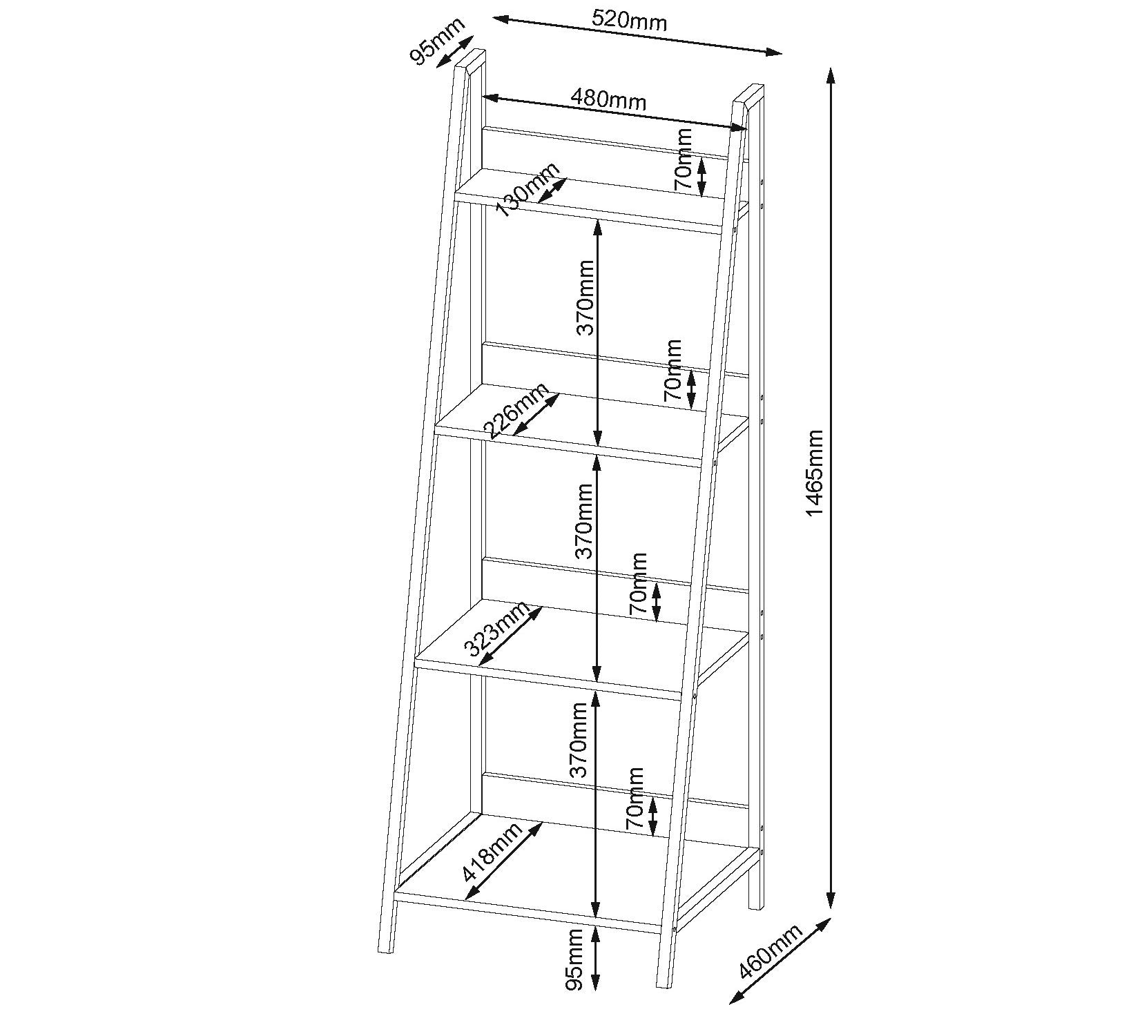This ladder style bookcase offers ample graduated depth shelving. Finished in an Oak effect with grey metal frames, can be used on its own or alongside our matching ladder desk unit to create a run of wall units. W52 x D46 x H146 cm