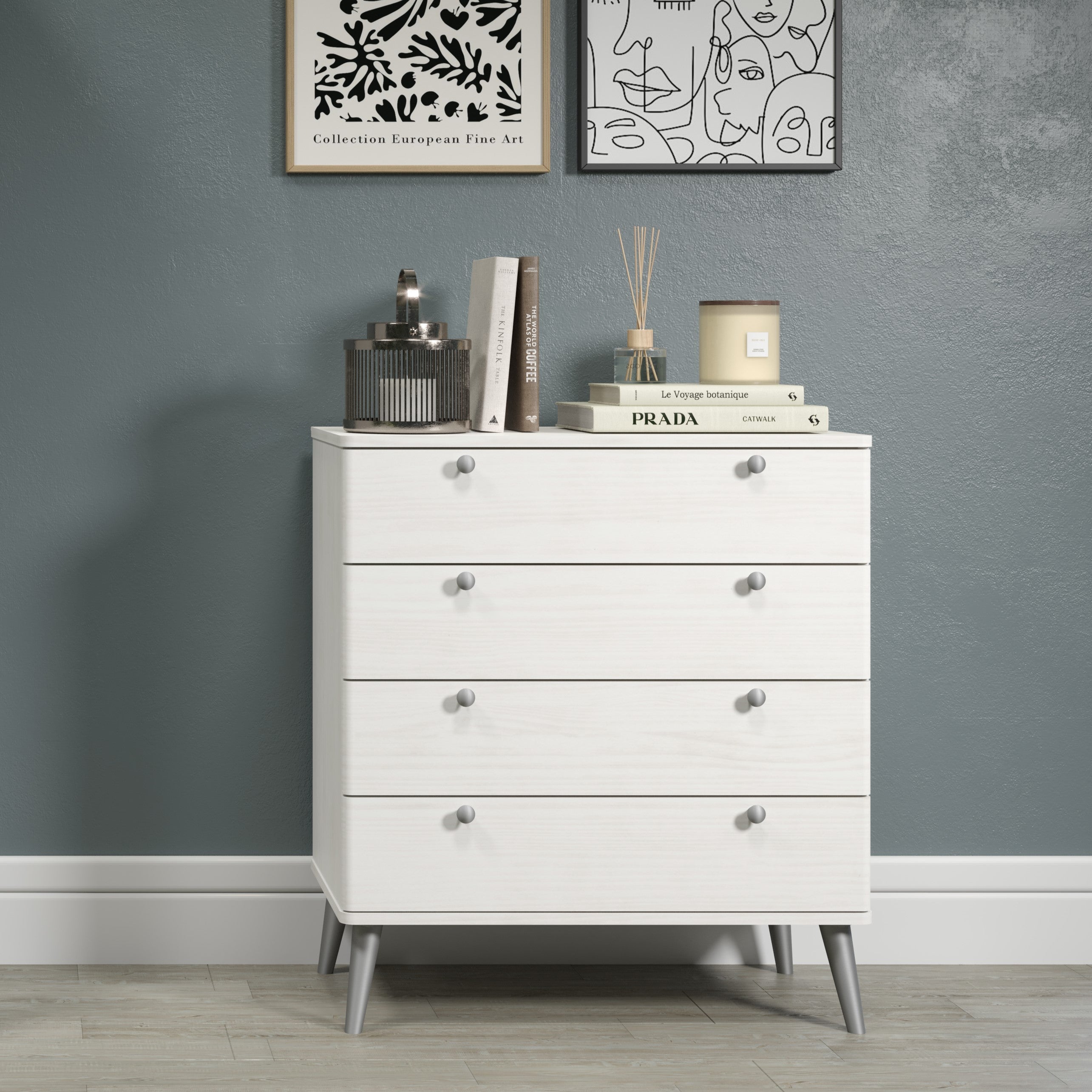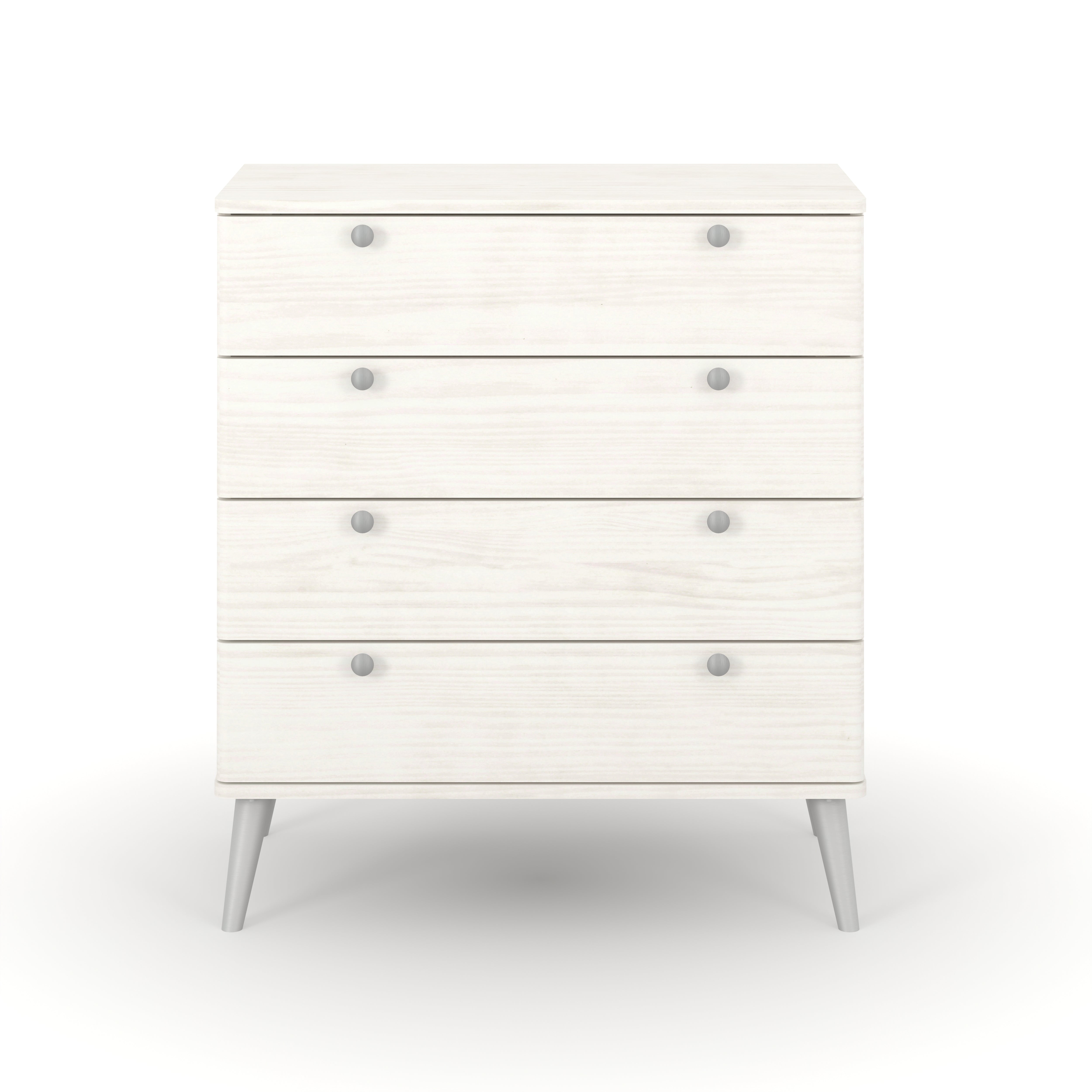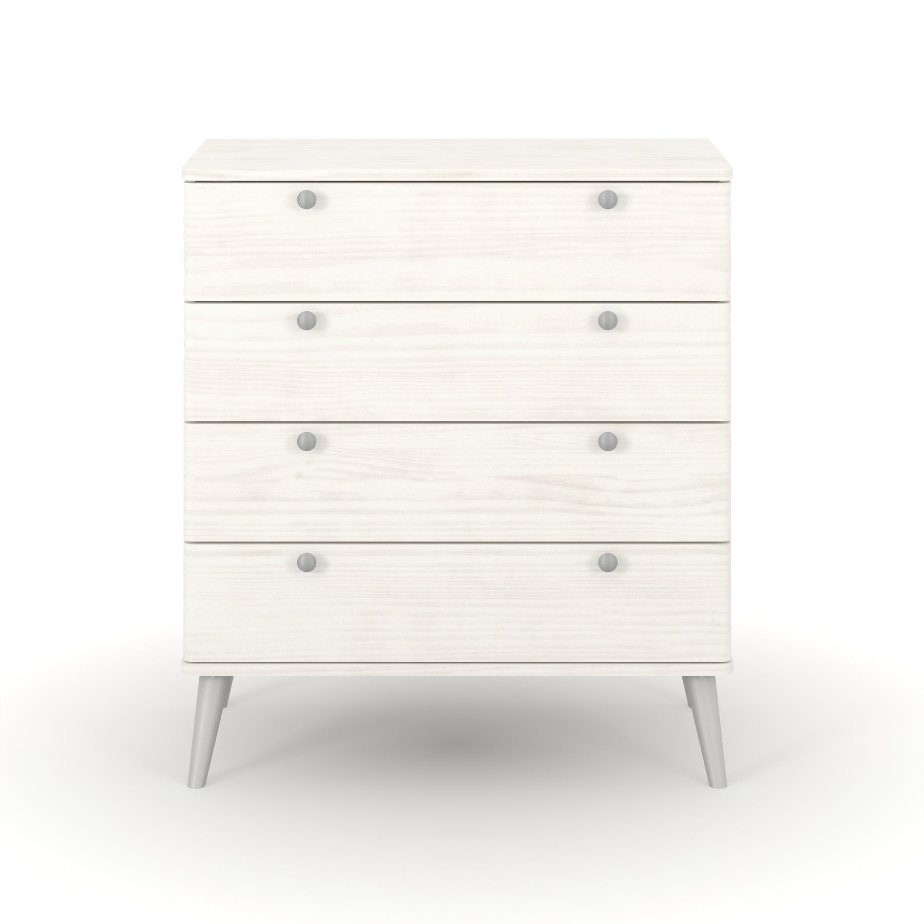 A four-drawer chest that takes our signature Augusta collection in a new direction by introducing soft rounded edges with a white wax finish that accentuates the all the natural characteristics of the responsibly sourced pine it is made from. With soft rounded handles and mid-century tapered legs, made from plastic and finished in a subtle matte silver, it creates a truly striking, clean look that would be a suitable addition to any bedroom. Compact in its design, this chest of drawers comes with four wide spacious drawers opened via a wooden drawer runner. It is easily to assemble, easy to clean and easy on the eye. W76.5 x D39.5 x H90.3 cm
