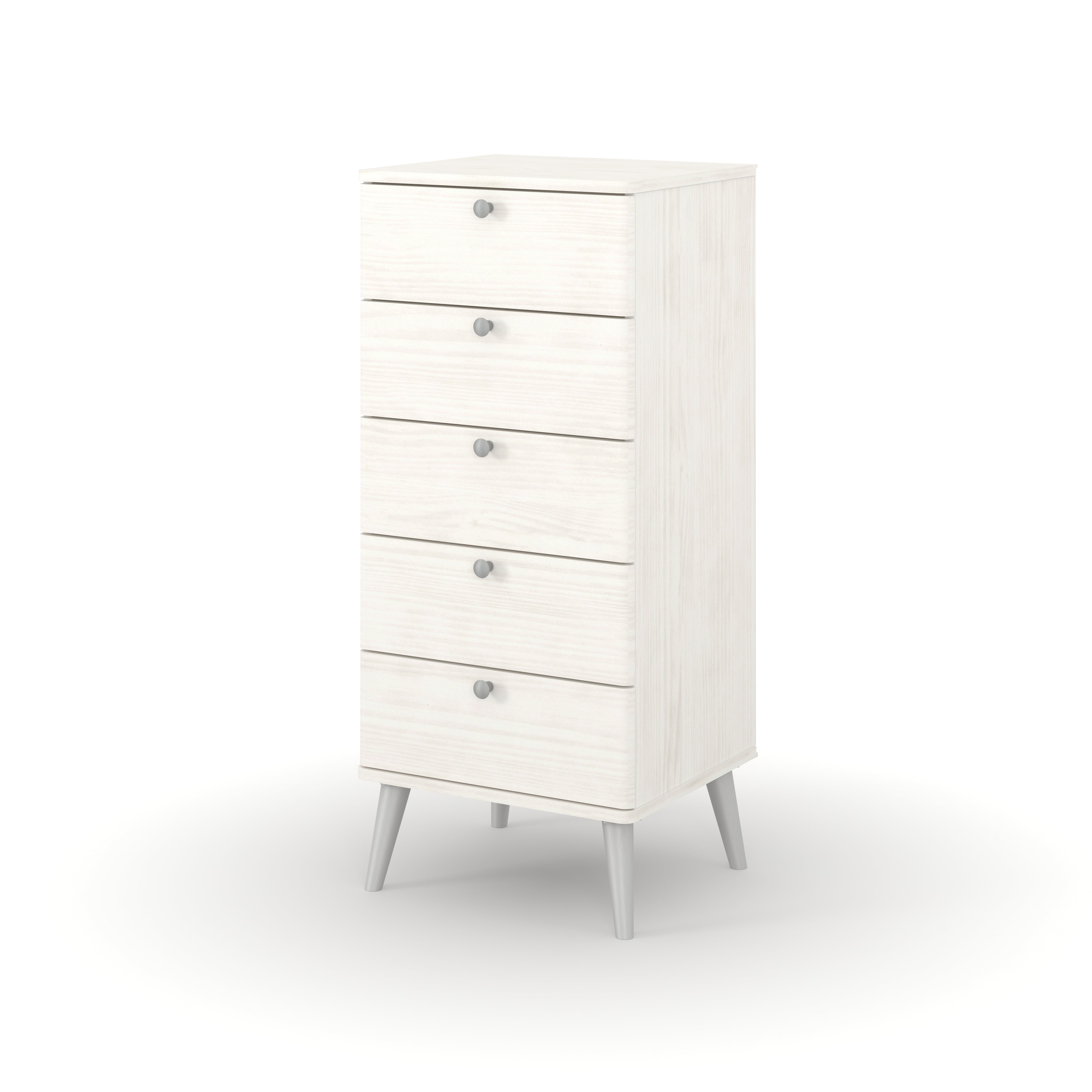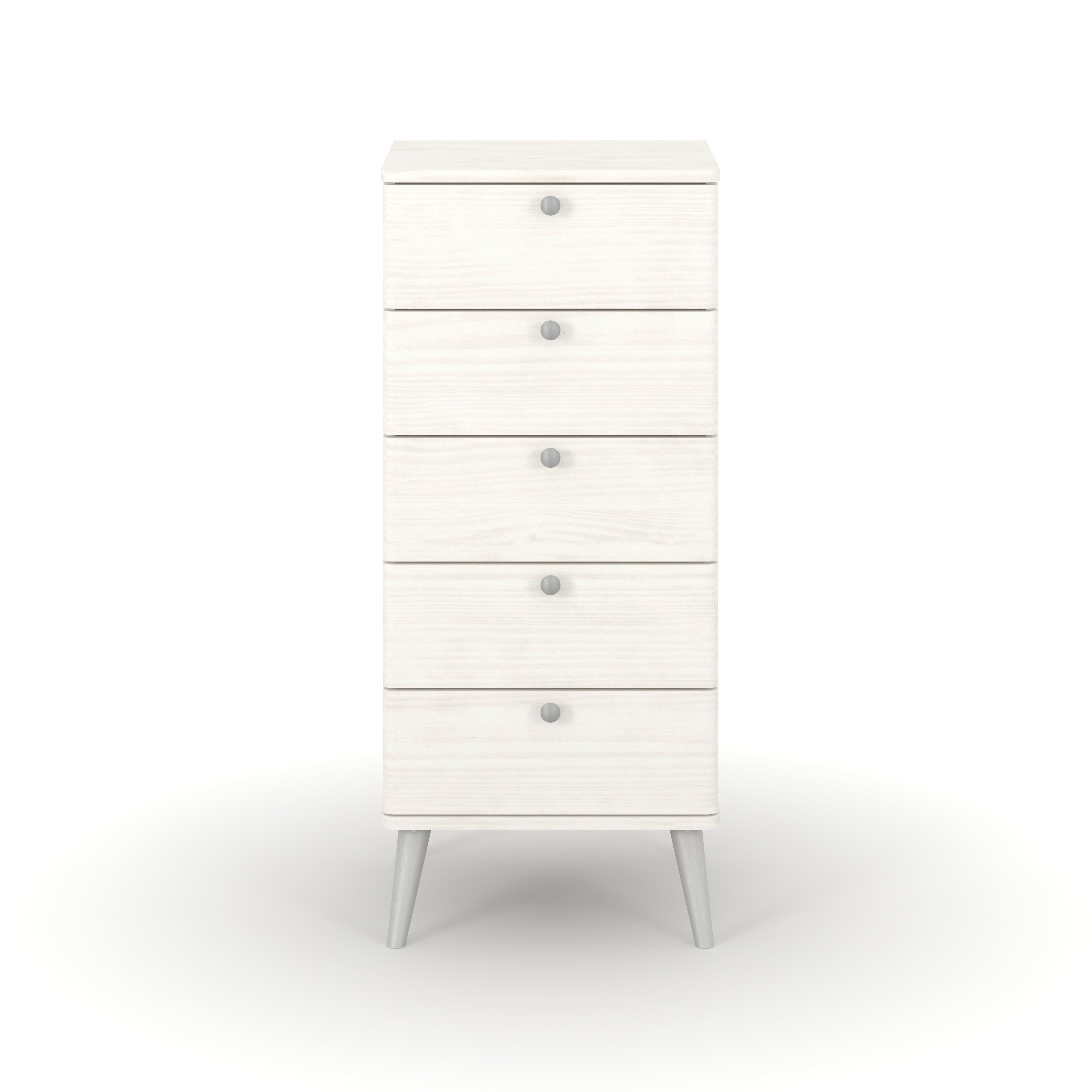 A five-drawer narrow chest that takes our signature Augusta collection in a new direction by introducing soft rounded edges with a white wax finish that accentuates the all the natural characteristics of the responsibly sourced pine it is made from. With soft rounded handles and mid-century tapered legs, made from plastic and finished in a subtle matte silver, it creates a truly striking, clean look that would be a suitable addition to any bedroom. Compact in its design, this chest of drawers comes with five spacious drawers opened via a wooden drawer runner. It is easily to assemble, easy to clean and easy on the eye. W45 x D39.5 x H90.3 cm