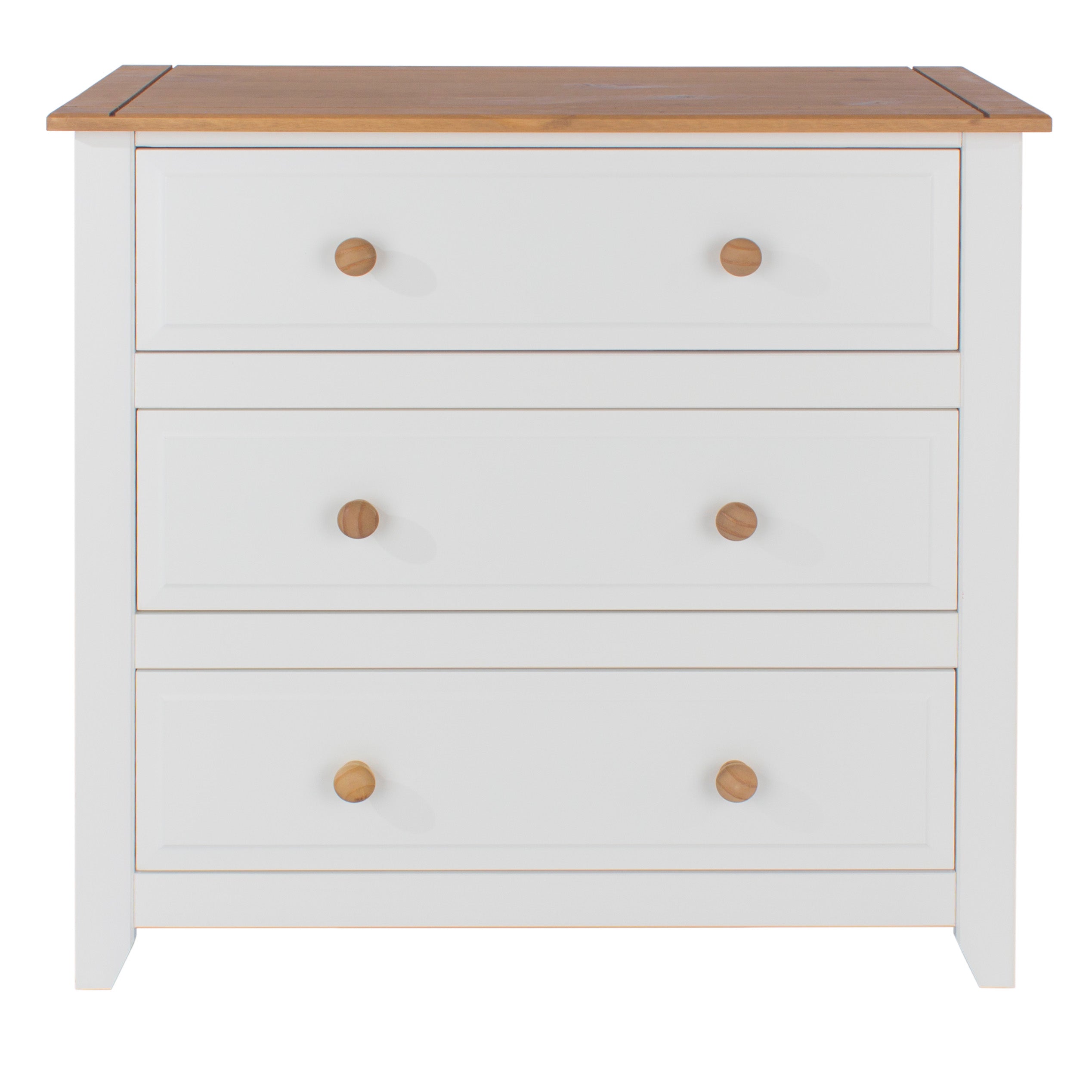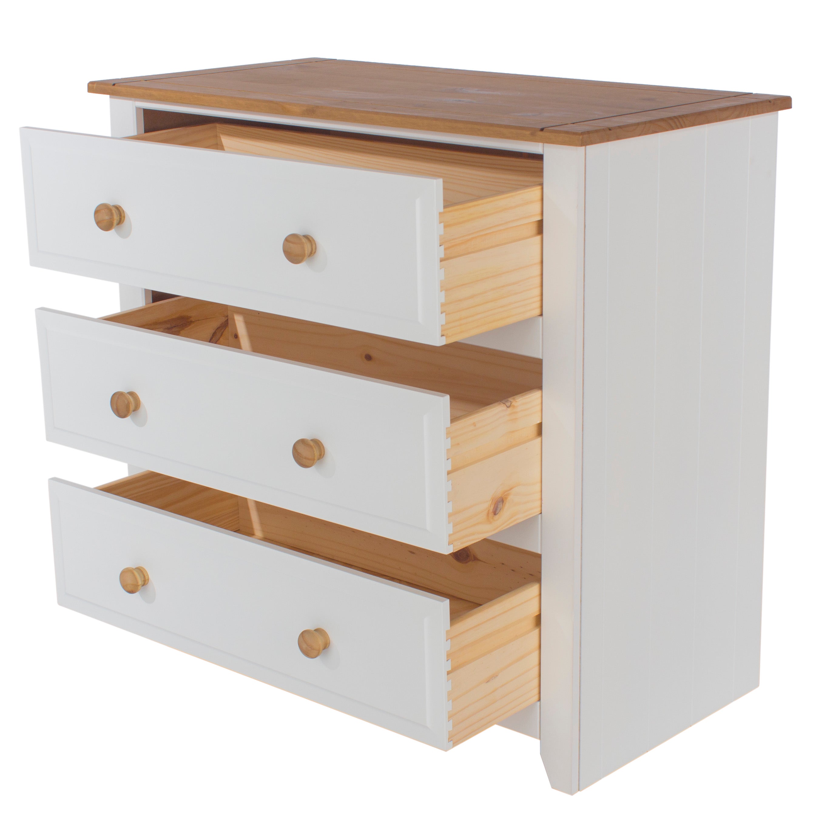 Ideal where space is a premium, our 3 drawer chest is finished in an arctic white paint and antique waxed pine top and matching handles. W83.5 x D43.5 x H80.5 cm