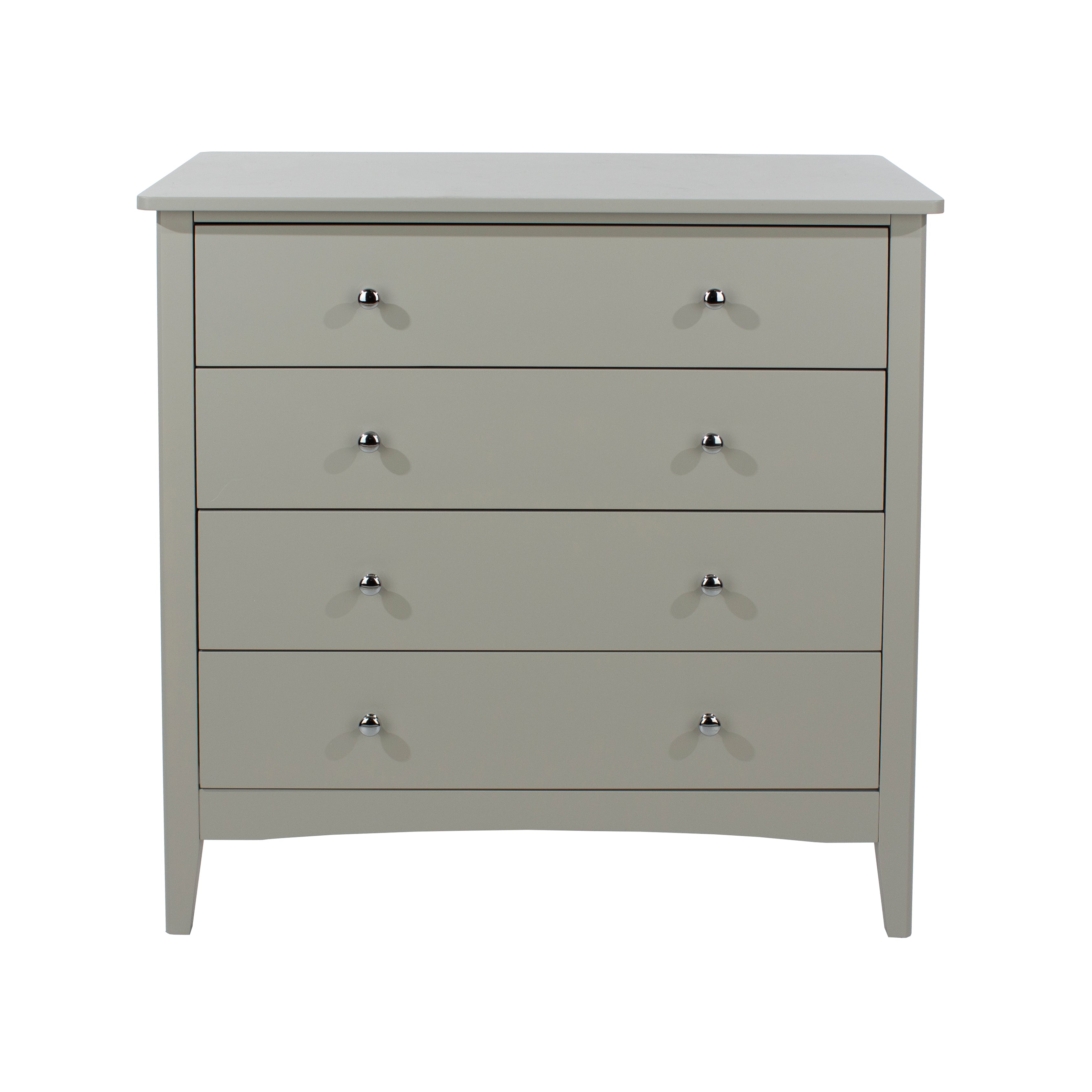 This 4 drawer chest features a soft grey paint finish, complimented with tapered legs, real metal handles and easy glide drawers W83 x D43 x H85 cm
