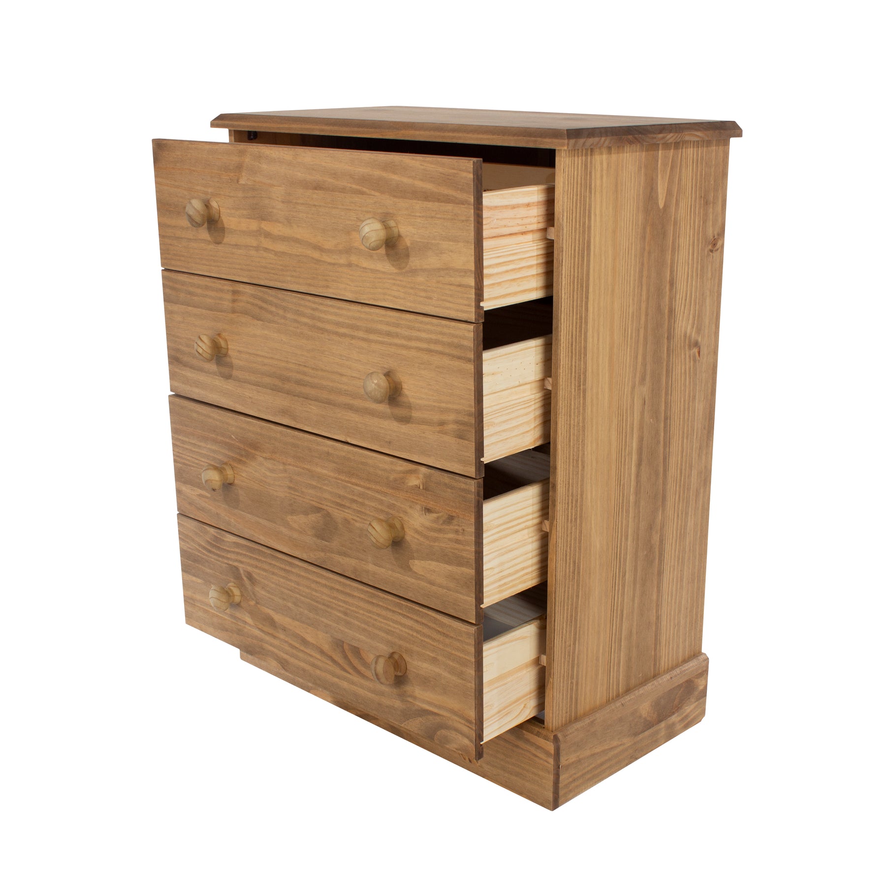 Our classic country style wood chest of drawers, generously proportioned with 4 useful drawers and a chunky solid top with profiled edge. Finished in an antique wax with matching wooden handles. W76.5 x D40.5 x H98 cm