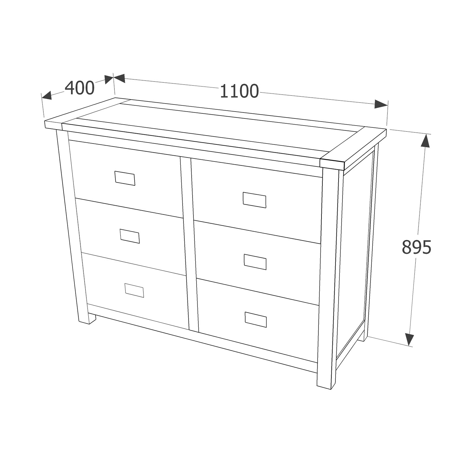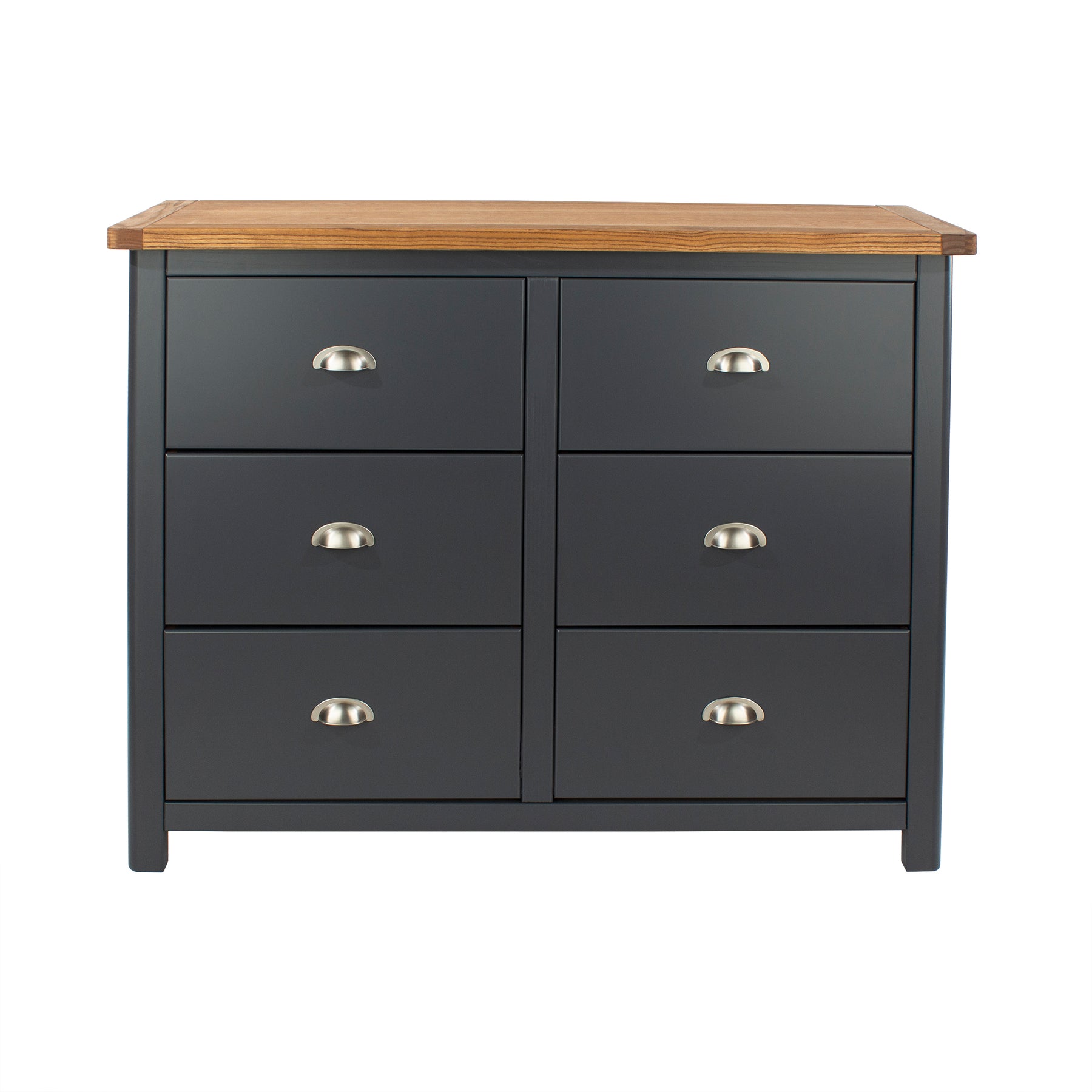 A real statement piece. This double wide chest features 6 drawers and is made using traditional materials and cabinet construction methods so it is easy for you to assemble. Finished in a luxurious midnight blue paint with an antique oak effect waxed hardwood framed top. Drawer boxes are made from hardwood with drawer stops for your safety and are finished with matt silver effect cup handles. W110 x D40 x H90 cm