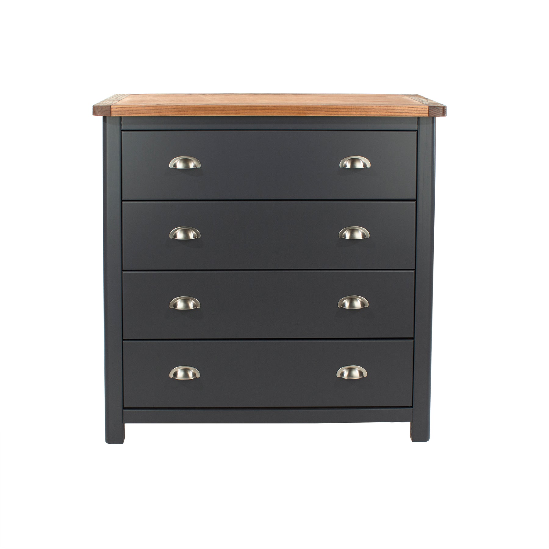 This handcrafted 4 drawer chest is made using traditional materials and cabinet construction methods so it is easy for you to assemble. Finished in a luxurious midnight blue paint with an antique oak effect waxed hardwood framed top. Drawer boxes are made from hardwood with drawer stops for your safety and are finished with matt silver effect cup handles. W90 x D40 x H94.5 cm