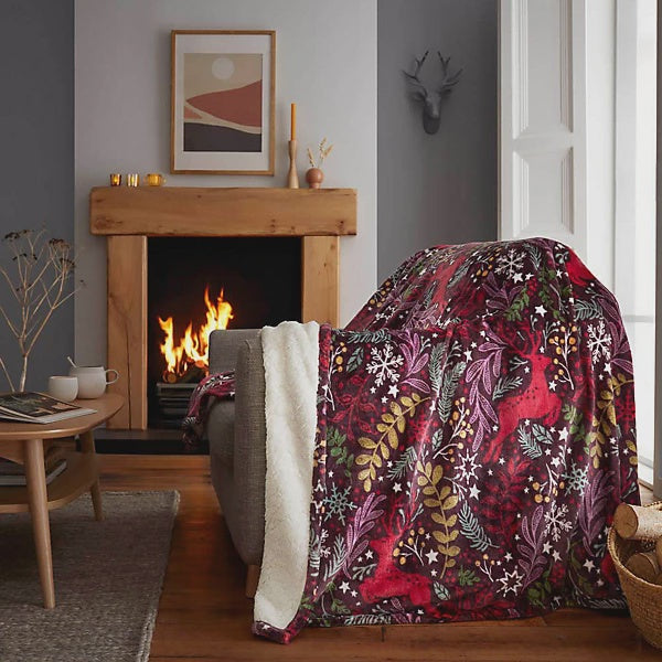 Winter Stags Sherpa Fleece Throw 130cm x 170cm Burgundy