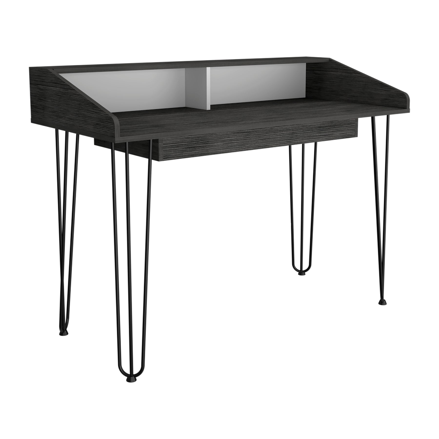 Stylish and functional, this desk is generous in proportion and features a reinforced desk base for stability along with steel hairpin legs. Made in an easy to clean, hardwearing white and carbon grey oak effect melamine finish with real metal hardware. W120.1 x D55.2 x H90 cm
