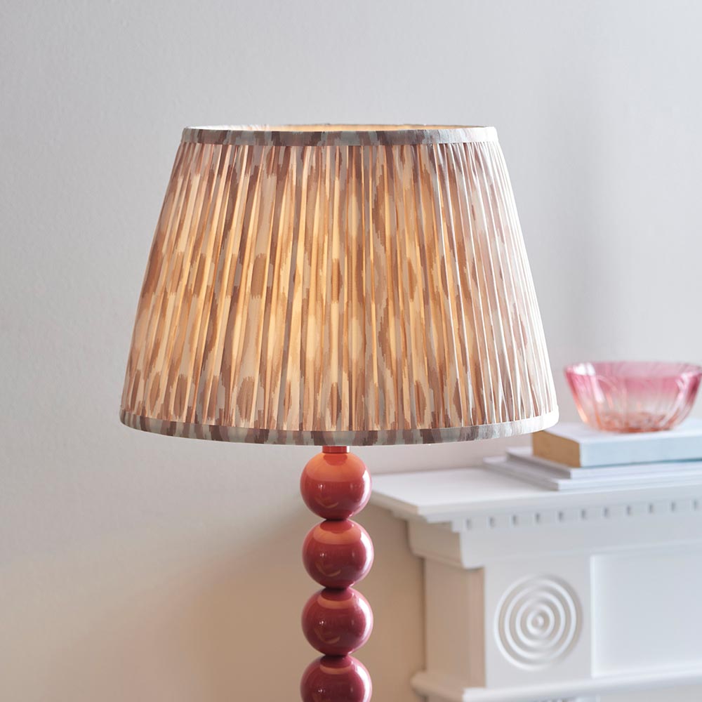 Add some colour to your home with this playful floor light. Multiple stacked metal spheres are finished in gloss pink clay paint with an E27 lamp holder, in-line foot switch and colour matched fabric flex. Paired with our natural 35cm Ikat shade to complete this perfect colour addition to your home.