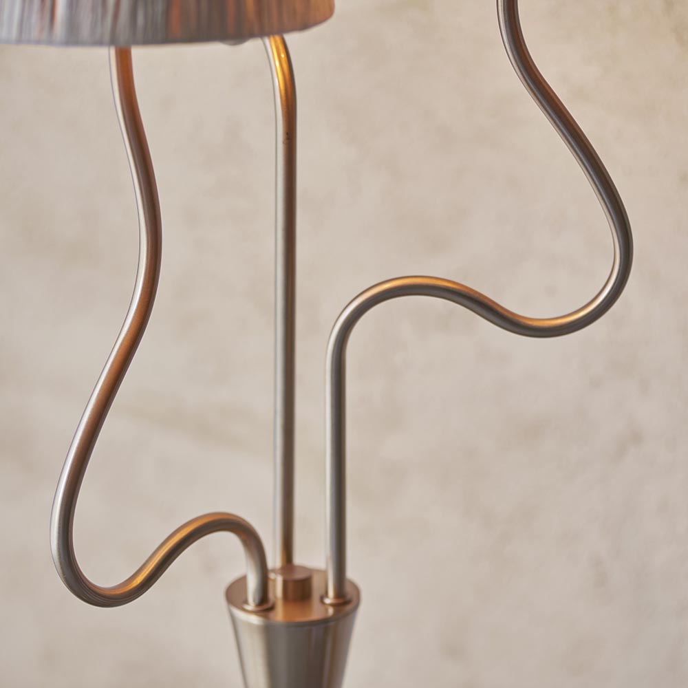 Add a playful style to your interior with this unique wriggle shaped 3 arm floor light, complete with wrapped raffia shades and finished in brushed aged brass, with in-line foot switch. Matching wall light, table light and pendant also available.