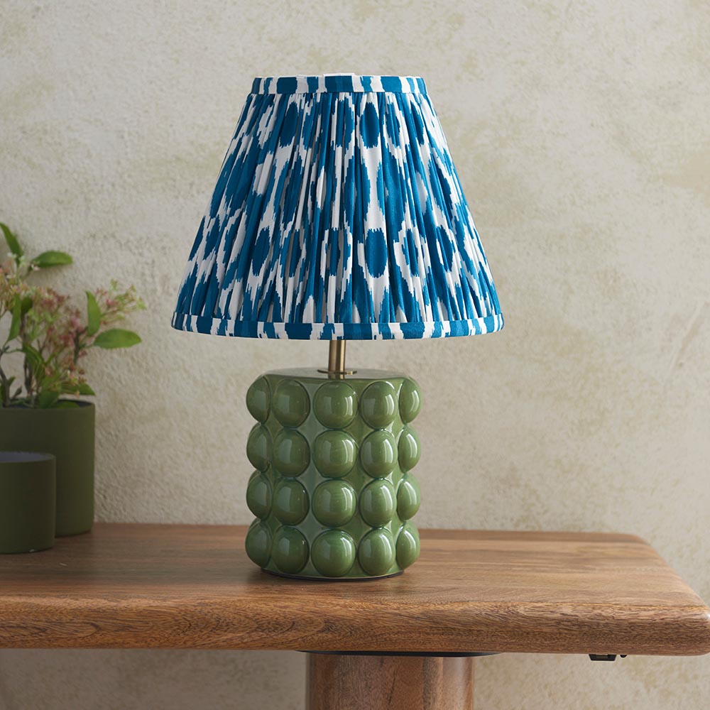This playful ceramic base features sculptured bobble shapes finished in a gloss olive green glaze. With a switched brass B22 lamp holder and grey braided flex, paired with our vibrant marlin blue 25cm Ikat shade.