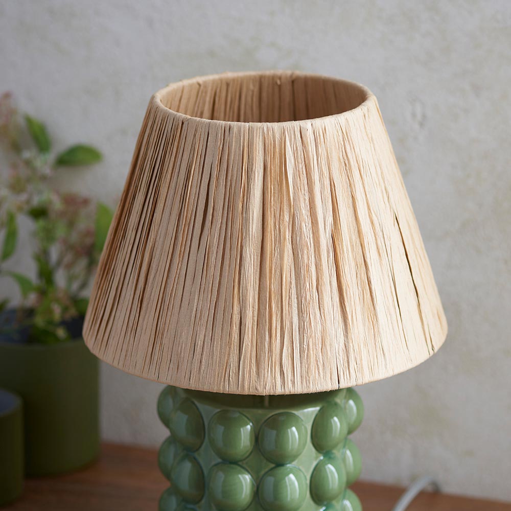 This playful ceramic base features sculptured bobble shapes finished in a gloss olive green glaze. With a switched brass B22 lamp holder and grey braided flex, paired with our 24cm Raffia shade.