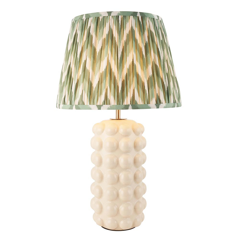 An interior must have, this playful ceramic table light features sculptured bobble shapes finished in a gloss vintage white crackle glaze. With a switched brass B22 lamp holder and grey braided flex; paired with our bold Cotswold green 35cm Zigzag shade for the perfect interior addition.