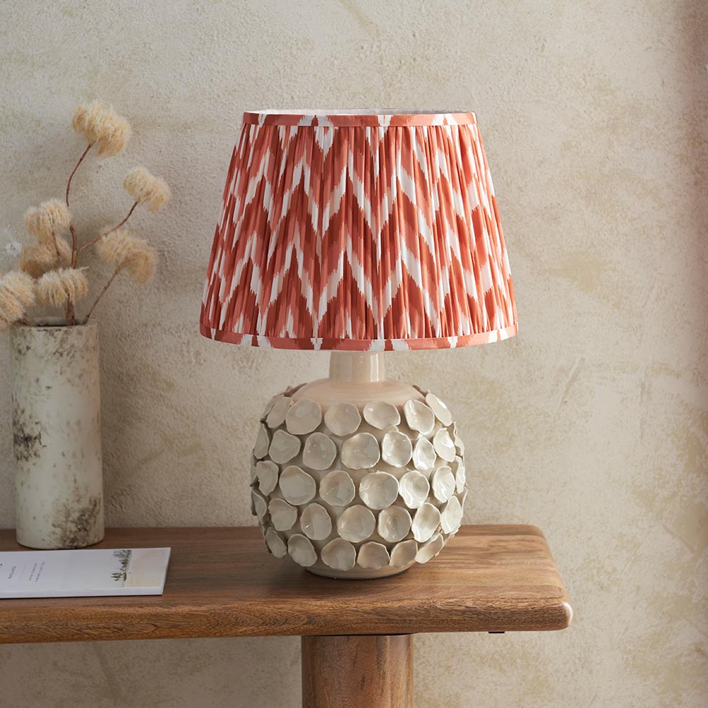 Inspired by nature, this hand decorated sculptured ceramic table light is finished in a gloss vintage white crackle glaze; with a switched brass B22 lamp holder and natural colour braided flex. Paired with our bright apricot orange 35cm Zigzag shade for the perfect interior addition.