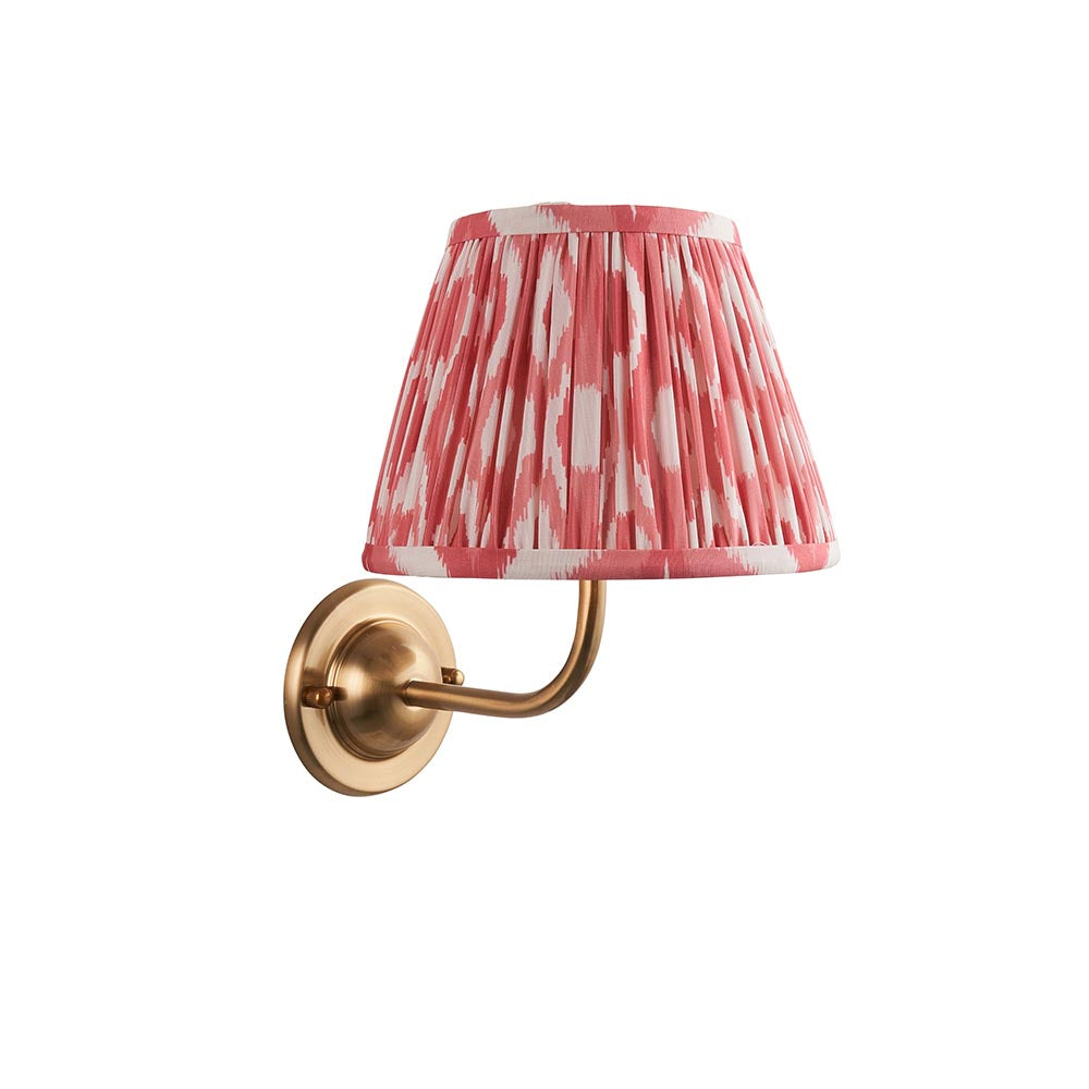 An ageless dome shaped wall light with a simple curve arm, finished in brushed aged brass. Paired with our vibrant coral pink 20cm Ikat shade, for a timeless look.