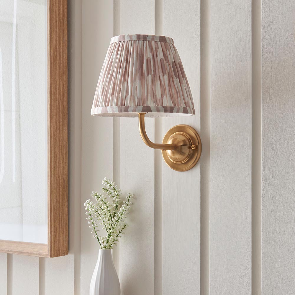 An ageless dome shaped wall light with a simple curve arm, finished in brushed aged brass. Paired with our natural 20cm Ikat shade, for a timeless look.