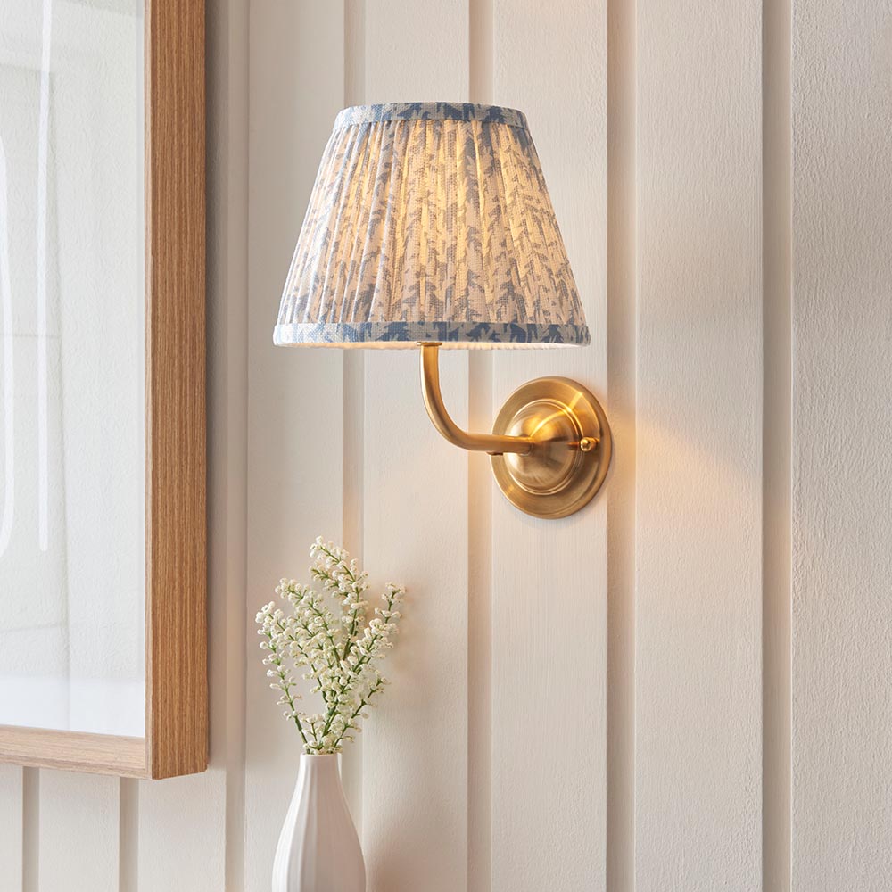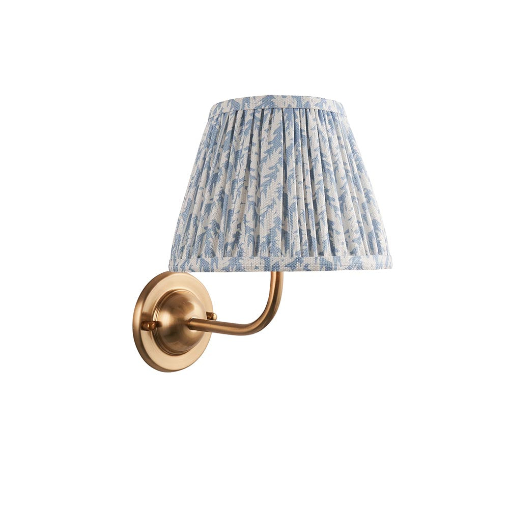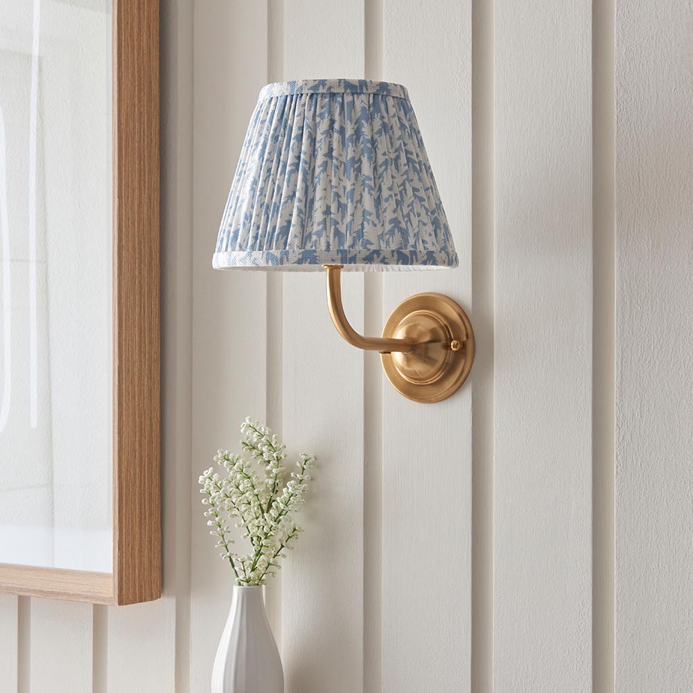 An ageless dome shaped wall light with a simple curve arm, finished in brushed aged brass. Paired with our subtle shell bay blue 20cm Leaf shade, for a timeless look.