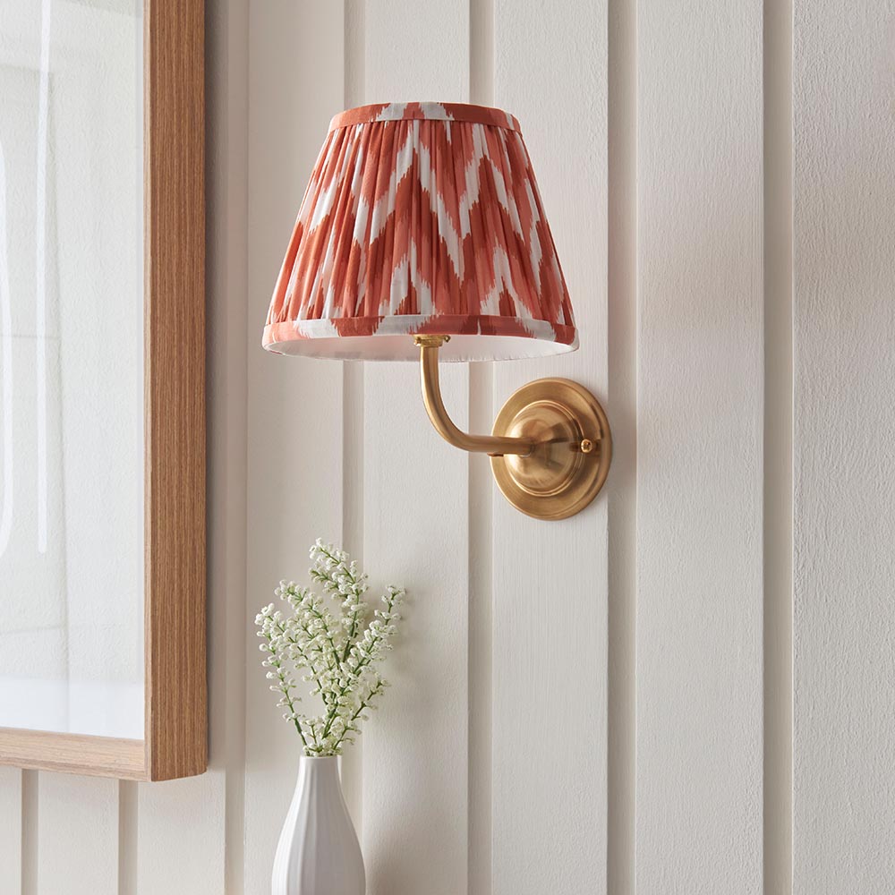 An ageless dome shaped wall light with a simple curve arm, finished in brushed aged brass. Paired with our bright apricot orange 20cm Zigzag shade, for a timeless look.