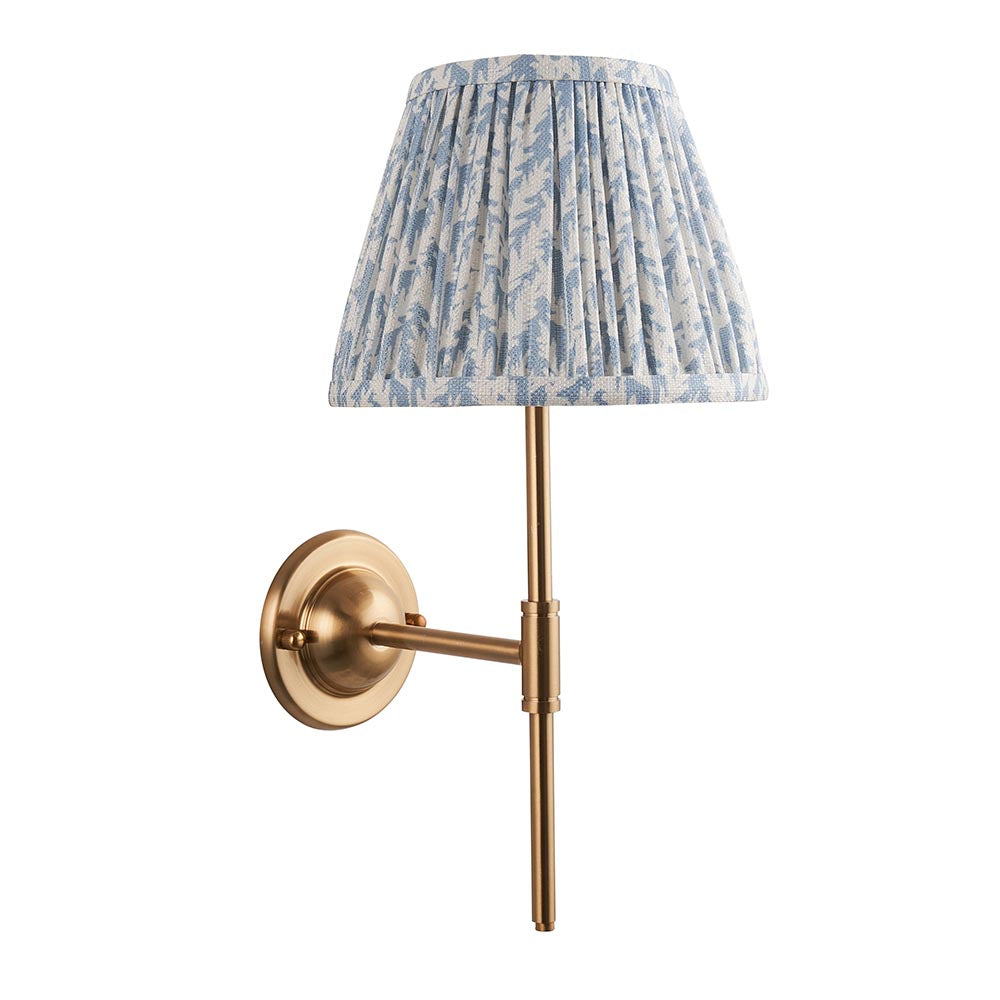 A classic and understated wall light featuring a dome shaped wall back with an elegant linear arm. Perfect for many areas of your home, finished in brushed aged brass with our subtle shell bay blue 20cm Leaf shade, to complete the look.