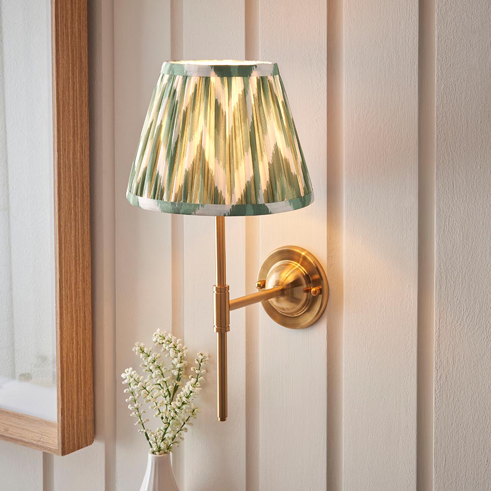 A classic and understated wall light featuring a dome shaped wall back with an elegant linear arm. Perfect for many areas of your home, finished in brushed aged brass with our bold Cotswold green 20cm Zigzag shade, to complete the look.