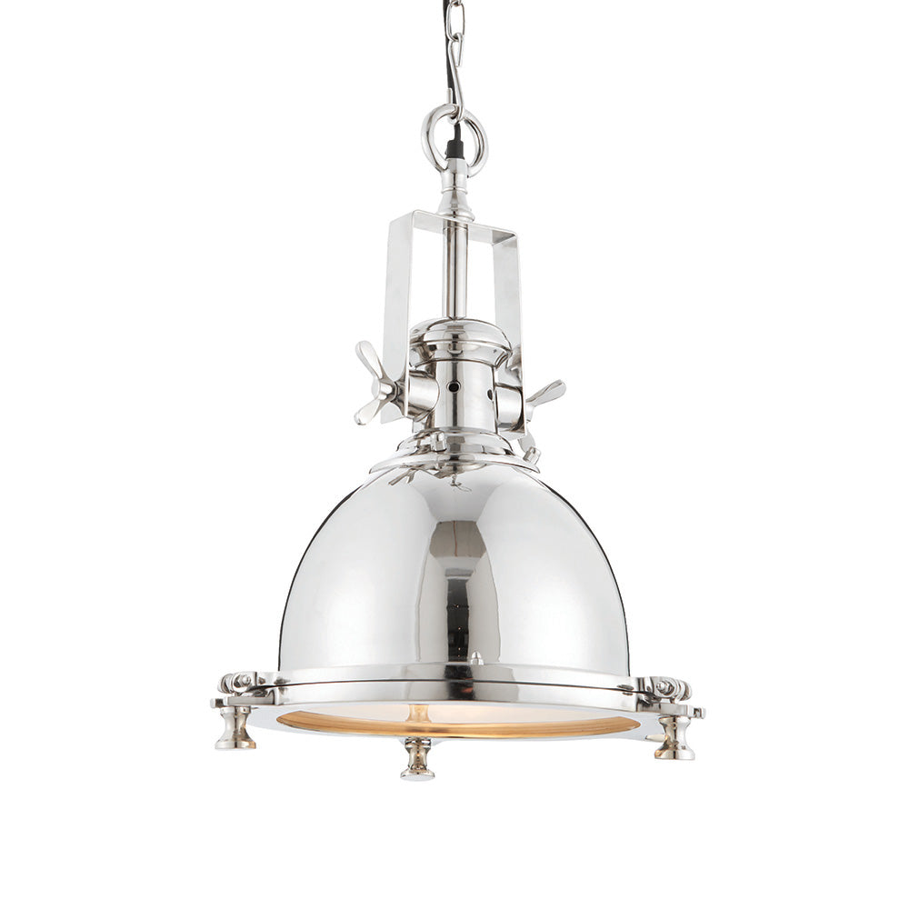 A bold and timeless bright nickel plated pendant light with sandblasted glass diffuser and authentic classic detailing.