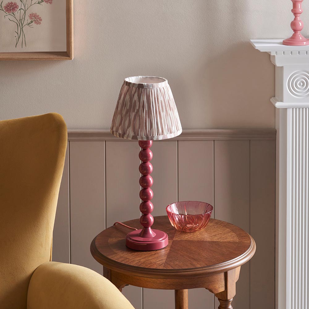 Add some colour to your home with this playful table light. Multiple stacked metal spheres finished in gloss pink clay paint with an E14 lamp holder, in-line on/off switch and colour matched fabric flex. Paired with our natural 20cm Ikat shade to complete this perfect colour addition to your home.