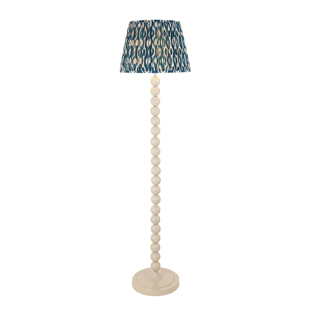 Add some colour to your home with this playful floor light. Multiple stacked metal spheres finished in gloss almond white paint with an E27 lamp holder, in-line foot switch and colour matched fabric flex. Paired with our vibrant marlin blue 40cm Ikat shade to complete this perfect colour addition to your home.