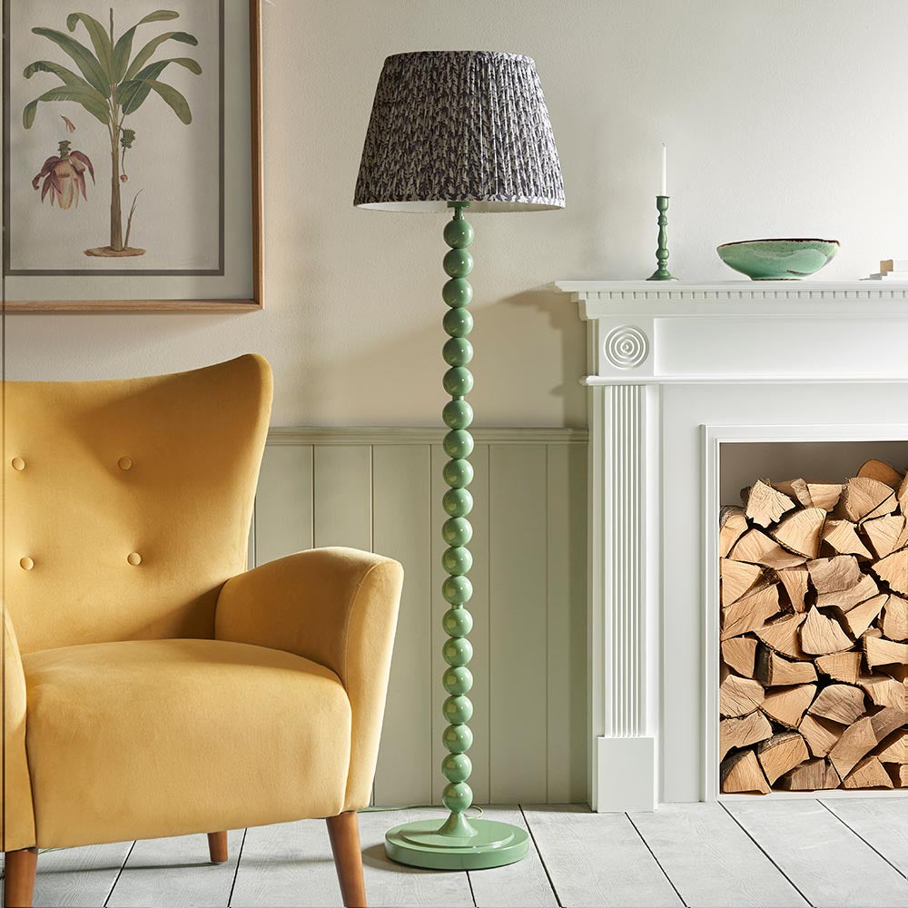 Add some colour to your home with this playful floor light. Multiple stacked metal spheres finished in gloss Cotswold green paint with an E27 lamp holder, in-line foot switch and colour matched fabric flex. Paired with our subtle pearl grey 40cm Leaf shade to complete this perfect colour addition to your home.
