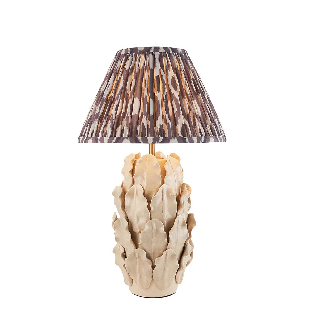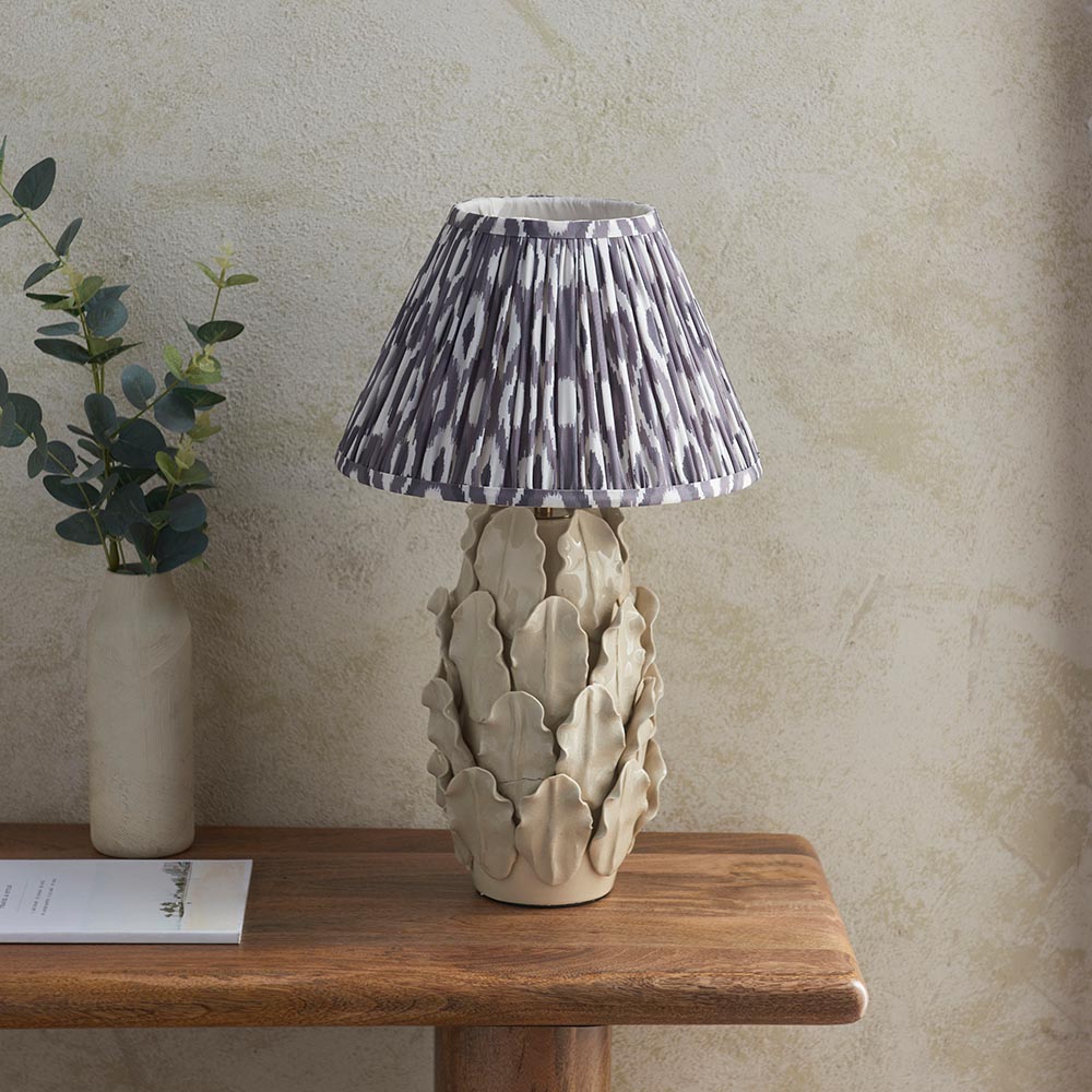 Inspired by palm and fern leaves, this ivory crackle glazed handmade ceramic table light is sure to add a touch of luxury to your home, finished with a complementary brushed aged brass B22 lamp holder and grey braided fabric flex. Paired with our stylish pearl grey 30cm Ikat shade to complete the look.