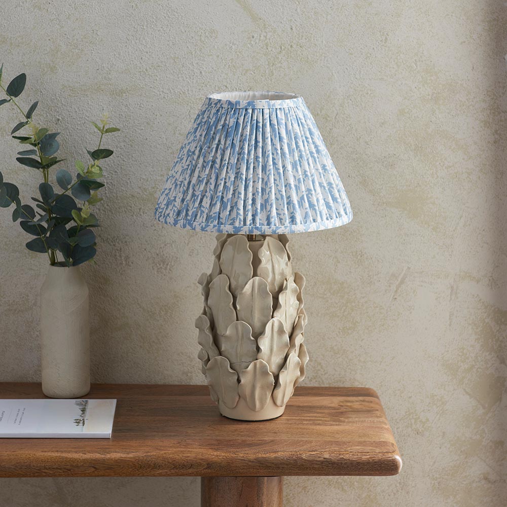 Inspired by palm and fern leaves, this ivory crackle glazed handmade ceramic table light is sure to add a touch of luxury to your home, finished with a complementary brushed aged brass B22 lamp holder and grey braided fabric flex. Paired with our subtle shell bay blue 30cm Leaf shade to complete the look.