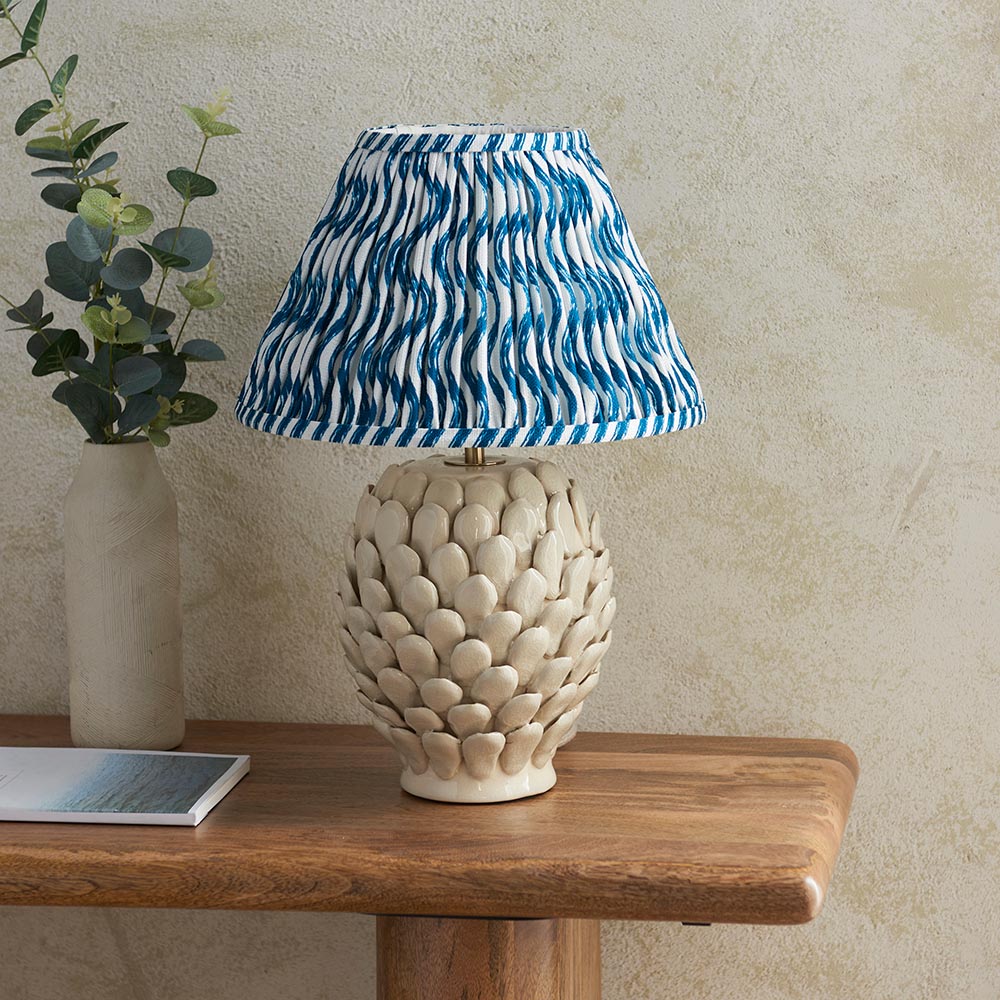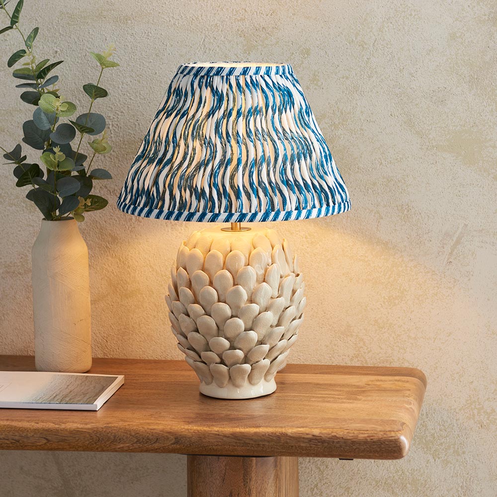 A beautifully organic shaped ceramic table light, decorated with handmade leaf shaped details and brushed aged brass switched B22 lamp holder. Paired with our vibrant marlin blue 30cm Ripple shade to complete the look.
