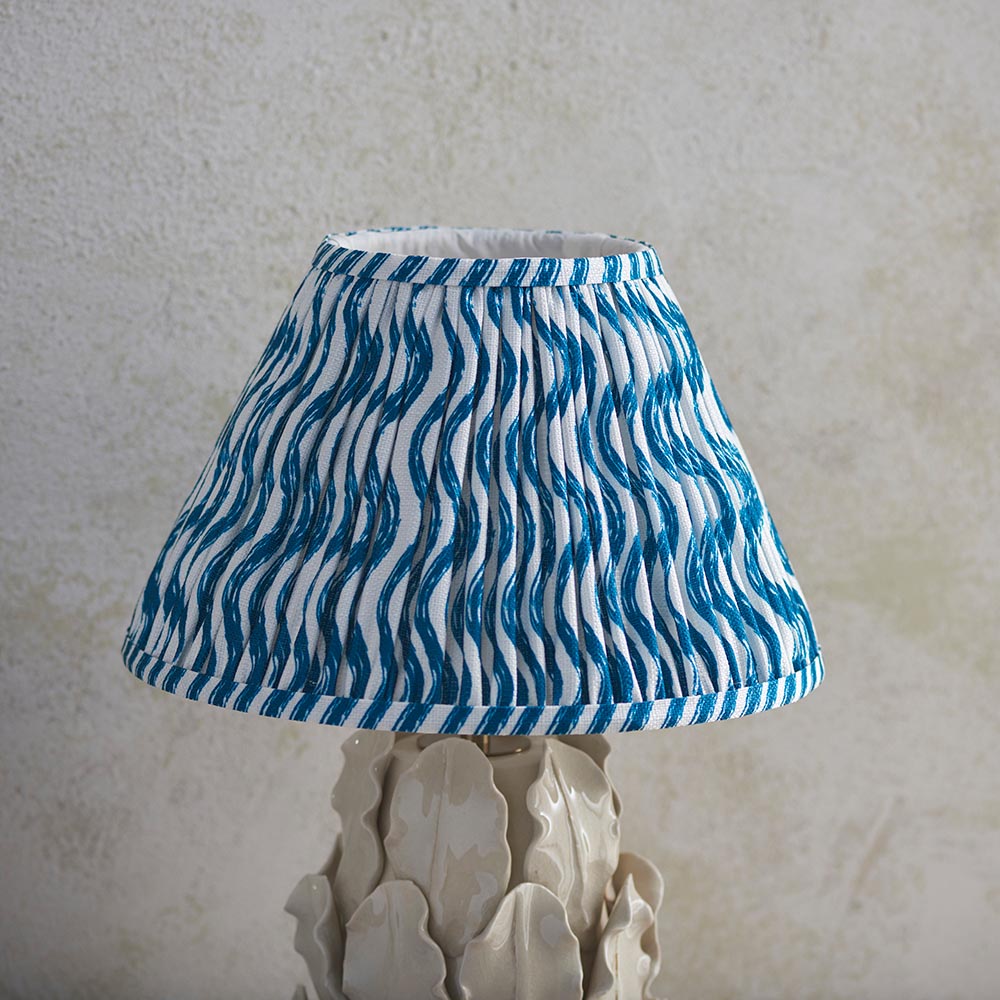 Inspired by palm and fern leaves, this ivory crackle glazed handmade ceramic table light is sure to add a touch of luxury to your home, finished with a complementary brushed aged brass B22 lamp holder and grey braided fabric flex. Paired with our vibrant marlin blue 30cm Ripple shade to complete the look.