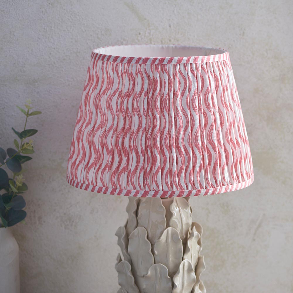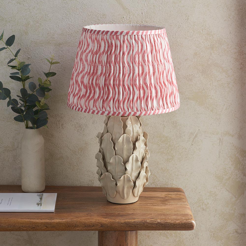 Inspired by palm and fern leaves, this ivory crackle glazed handmade ceramic table light is sure to add a touch of luxury to your home, finished with a complementary brushed aged brass B22 lamp holder and grey braided fabric flex. Paired with our bright coral pink 35cm Ripple shade to complete the look.