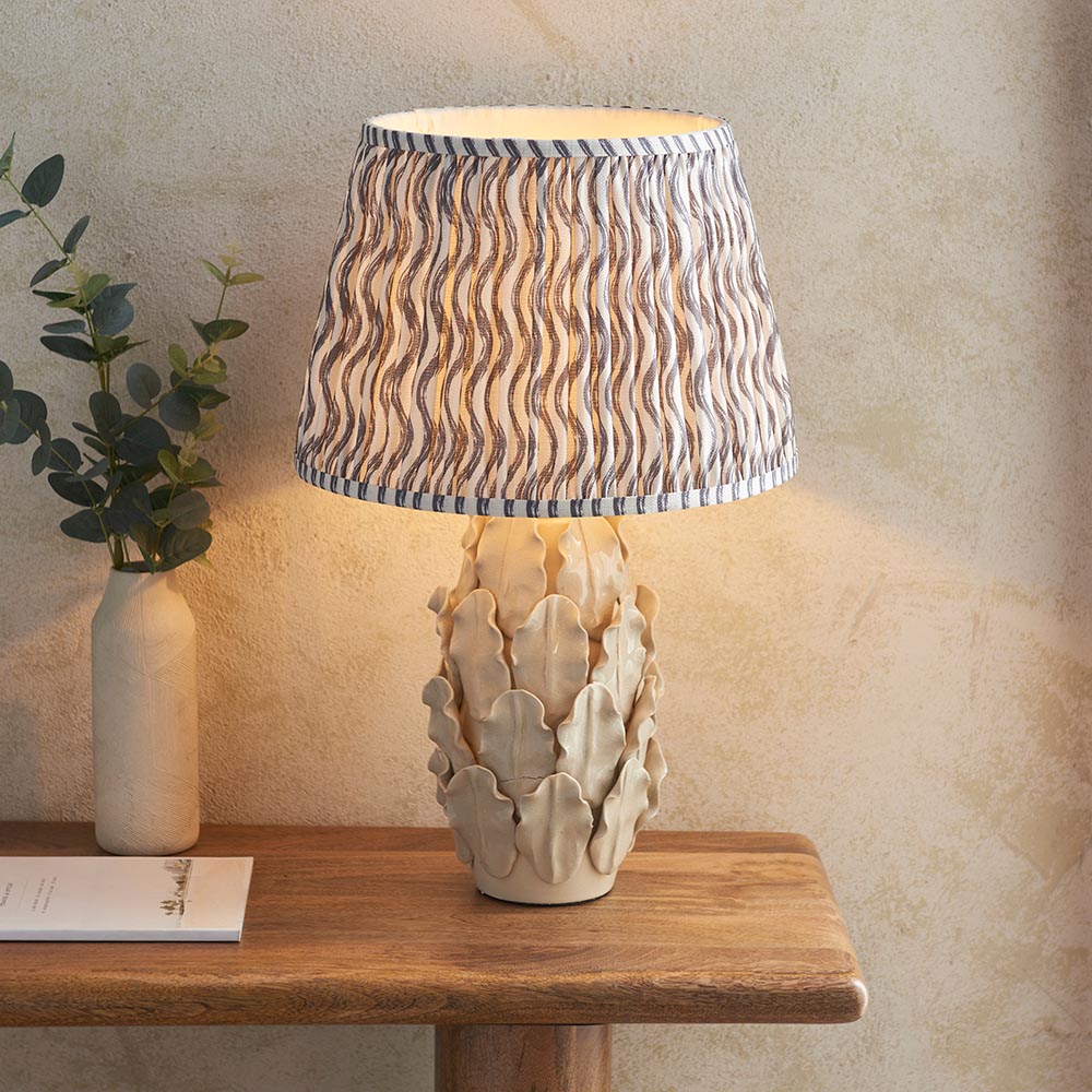 Inspired by palm and fern leaves, this ivory crackle glazed handmade ceramic table light is sure to add a touch of luxury to your home, finished with a complementary brushed aged brass B22 lamp holder and grey braided fabric flex. Paired with our stylish pearl grey 35cm Ripple shade to complete the look.