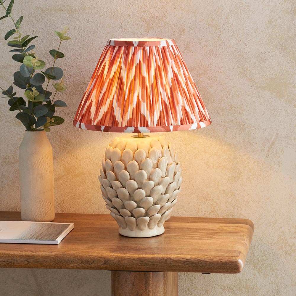 A beautifully organic shaped ceramic table light, decorated with handmade leaf shaped details and brushed aged brass switched B22 lamp holder. Paired with our bright apricot orange 30cm Zigzag shade to complete the look.