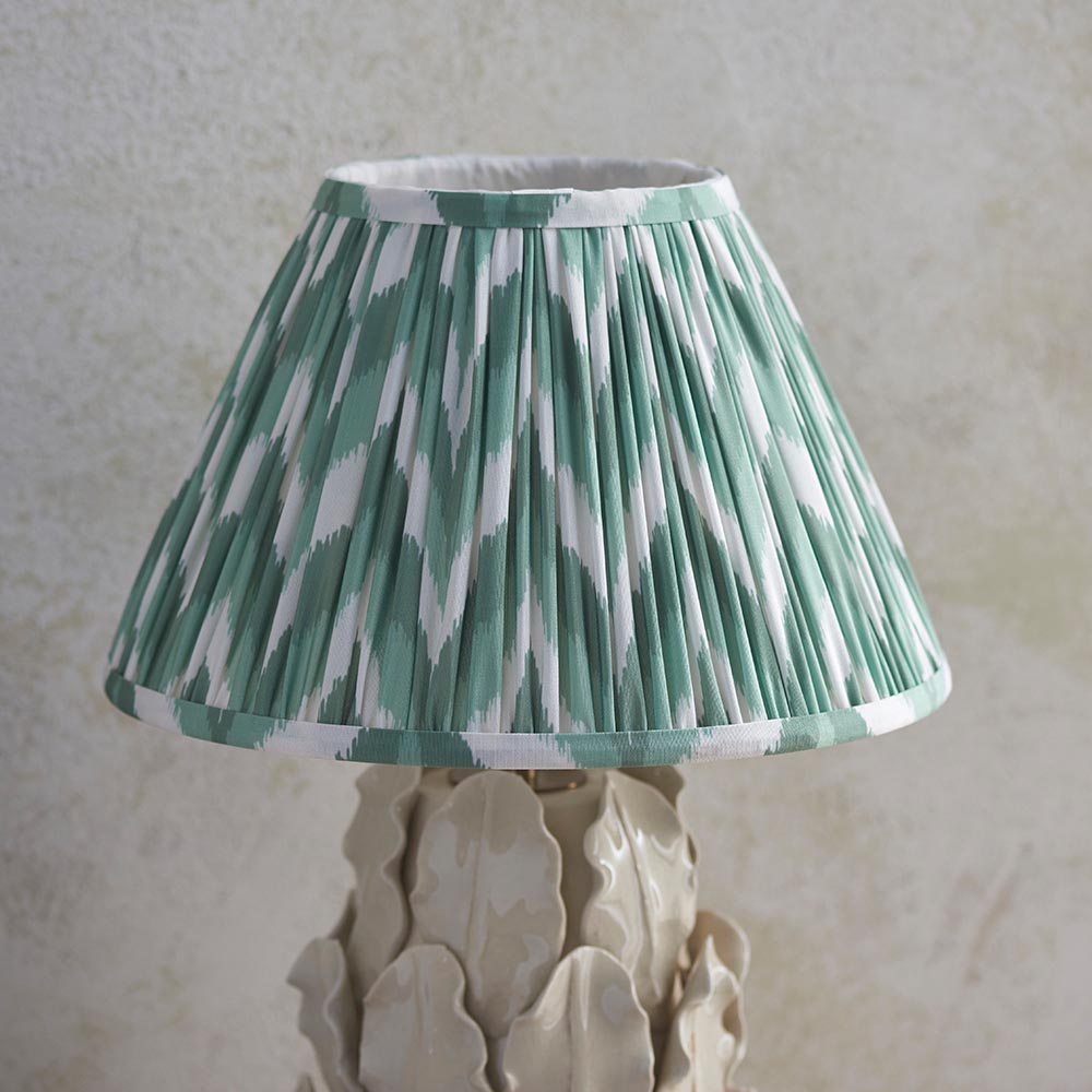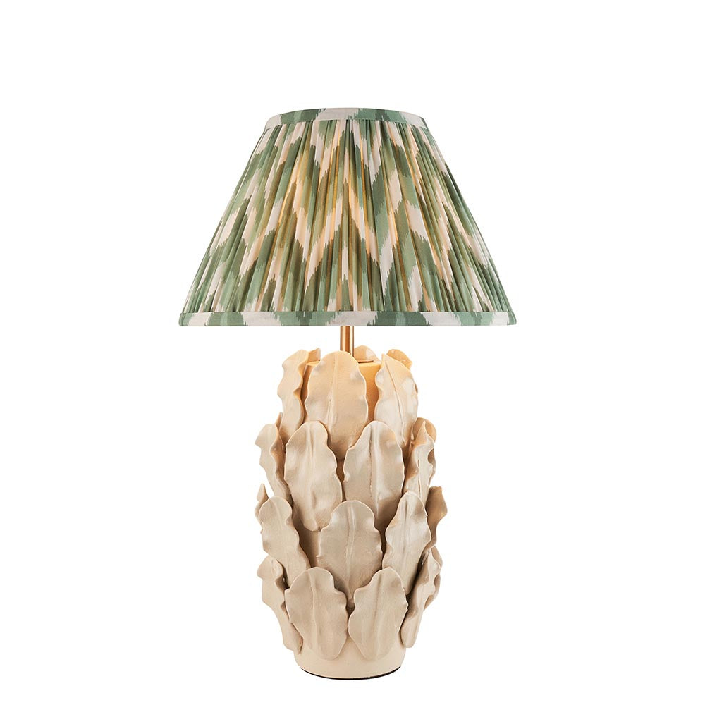 Inspired by palm and fern leaves, this ivory crackle glazed handmade ceramic table light is sure to add a touch of luxury to your home, finished with a complementary brushed aged brass B22 lamp holder and grey braided fabric flex. Paired with our bold Cotswold green 30cm Zigzag shade to complete the look.