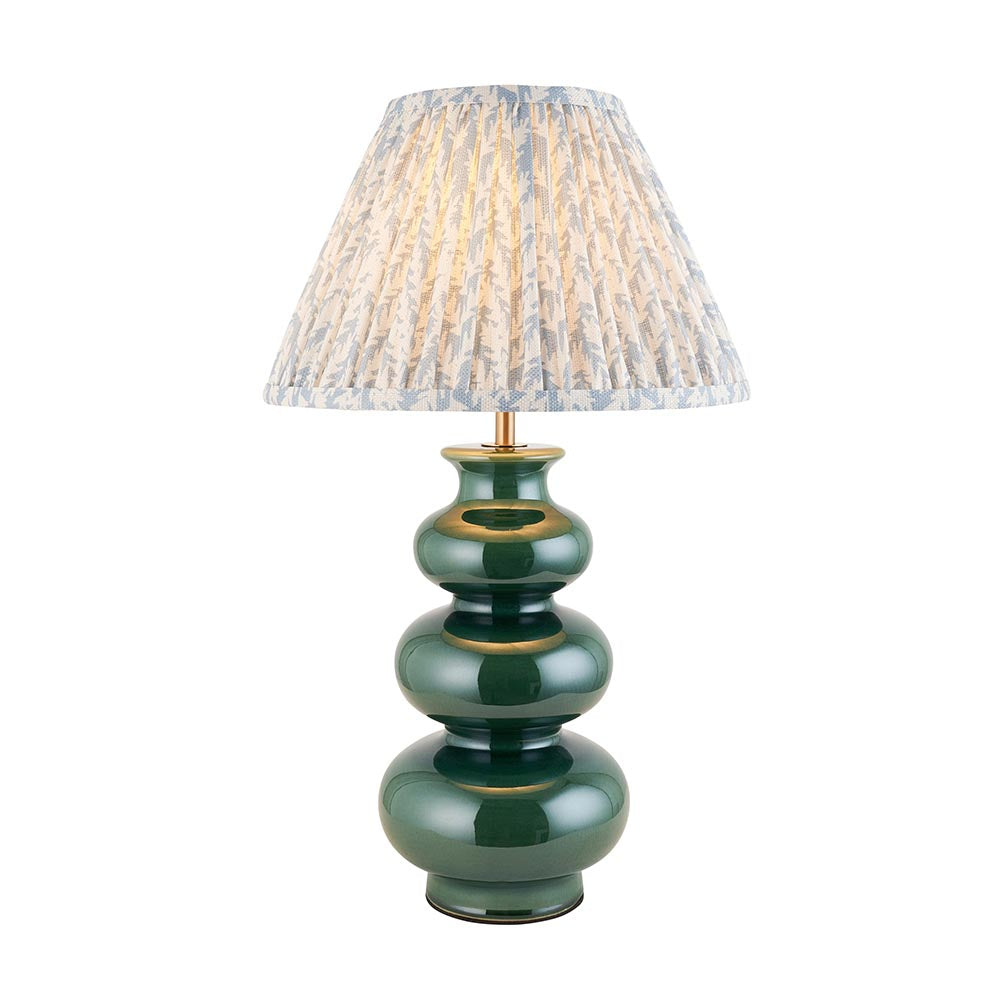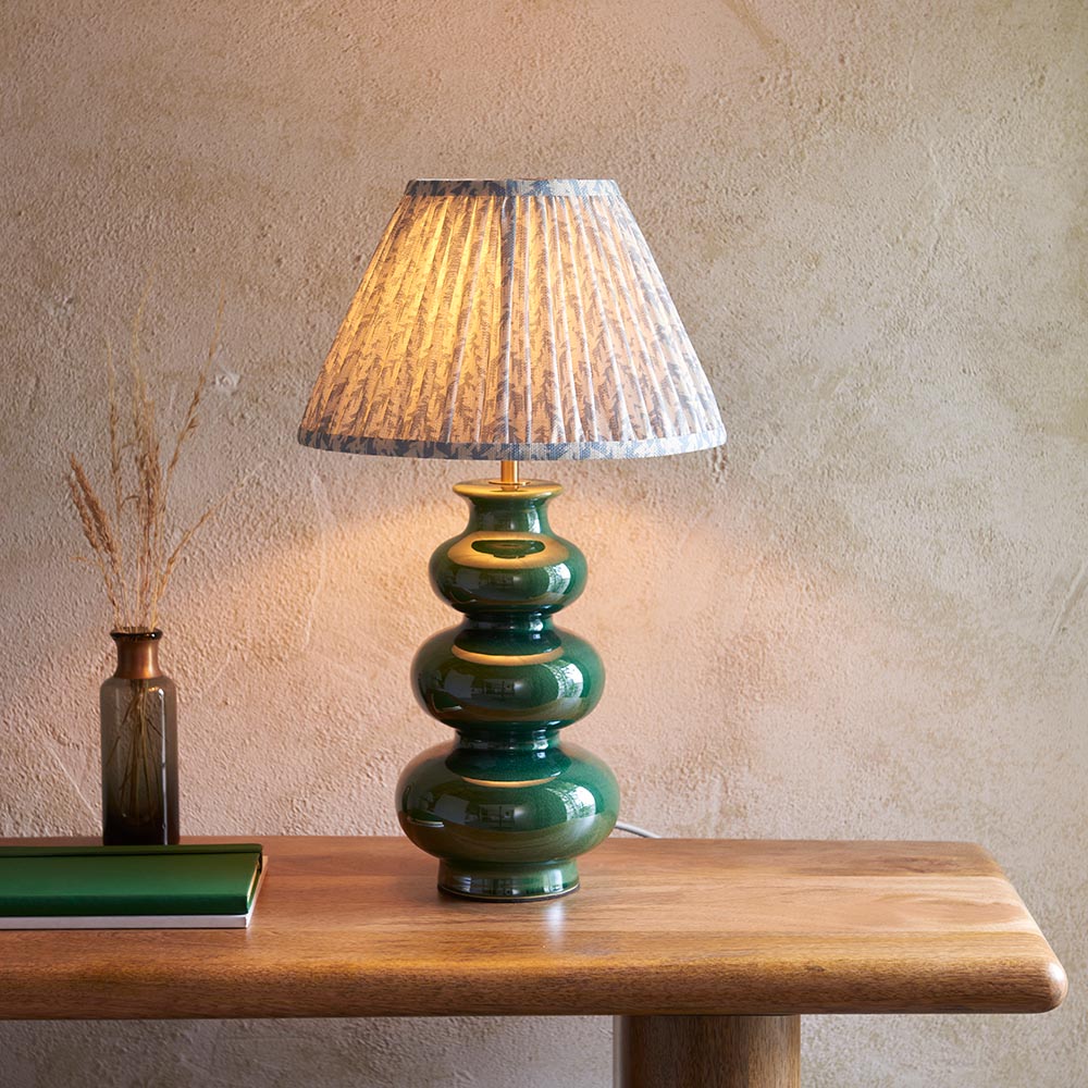 Inspired by the delicate curves of gourds from the past, with a shape perfectly scaled to suit bedrooms and lounge interiors. The handmade ceramic lamp base is finished in a beautiful gloss green reactive glaze, making each piece unique; with a brushed aged brass B22 switched lamp holder and grey braided flex. Paired with our subtle shell bay blue 30cm Leaf shade.