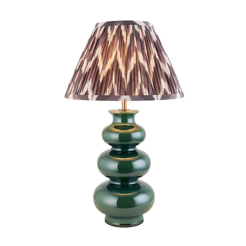 Inspired by the delicate curves of gourds from the past, with a shape perfectly scaled to suit bedrooms and lounge interiors. The handmade ceramic lamp base is finished in a beautiful gloss green reactive glaze, making each piece unique; with a brushed aged brass B22 switched lamp holder and grey braided flex. Paired with our stylish pearl grey 30cm Zigzag shade.