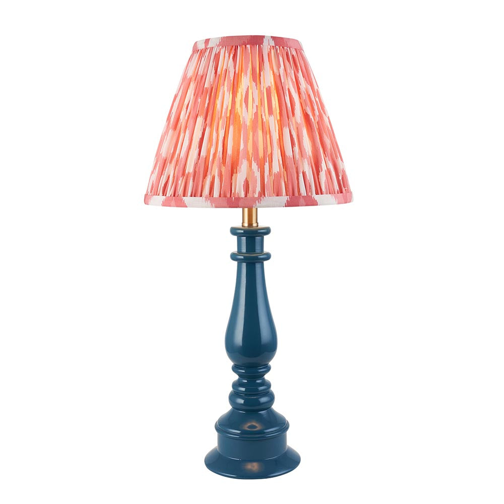 Getting its inspiration from turned classic staircase spindles, this table light is finished in high gloss marlin blue colour resin, with switched B22 brass lamp holder and pale braided fabric flex. Paired with our vibrant coral pink 25cm Ikat shade to complete this timeless country luxe look.
