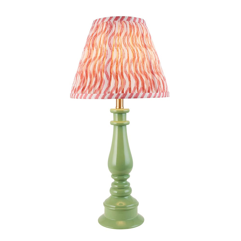 Getting its inspiration from turned classic staircase spindles, this table light is finished in high gloss Cotswold green colour resin, with switched B22 brass lamp holder and pale braided fabric flex. Paired with our bright coral pink 25cm Ripple shade to complete this timeless country luxe look.