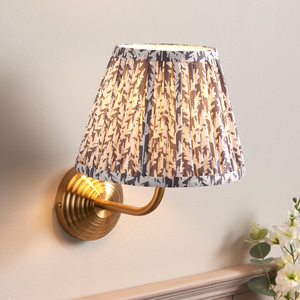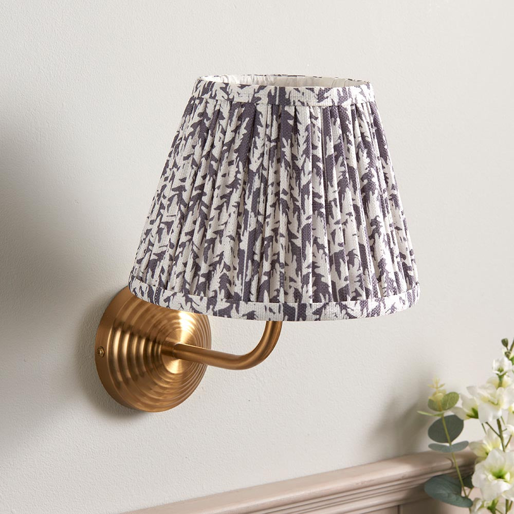 A multiple stepped wall light with a simple curve arm, finished in brushed aged brass. Paired with our subtle pearl grey 20cm Leaf shade for a classic look.