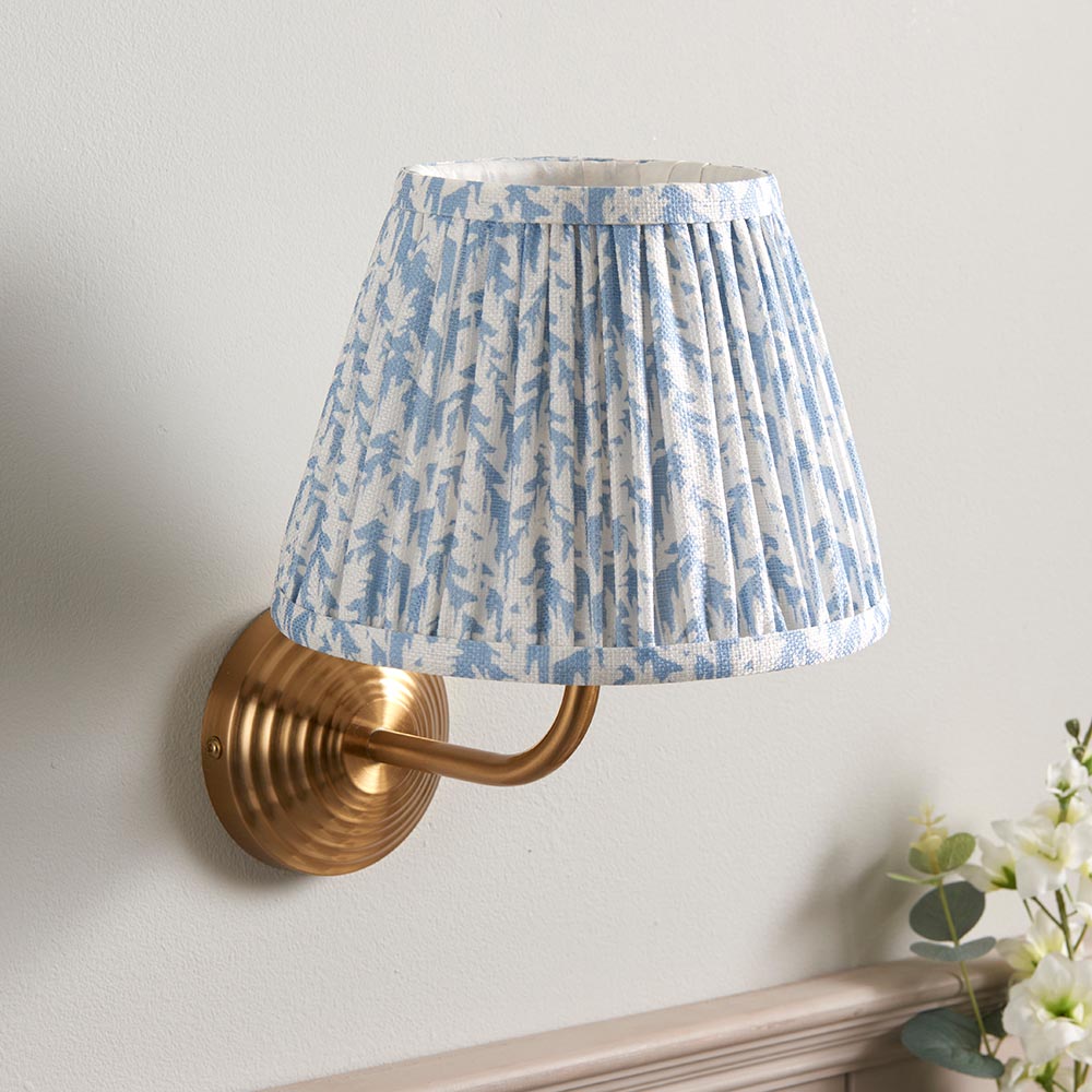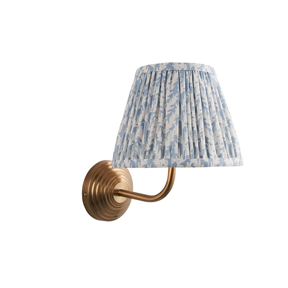 A multiple stepped wall light with a simple curve arm, finished in brushed aged brass. Paired with our subtle shell bay blue 20cm Leaf shade for a classic look.