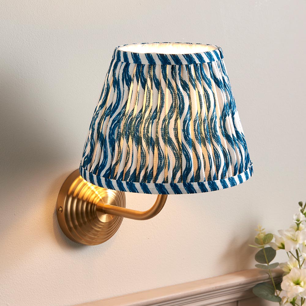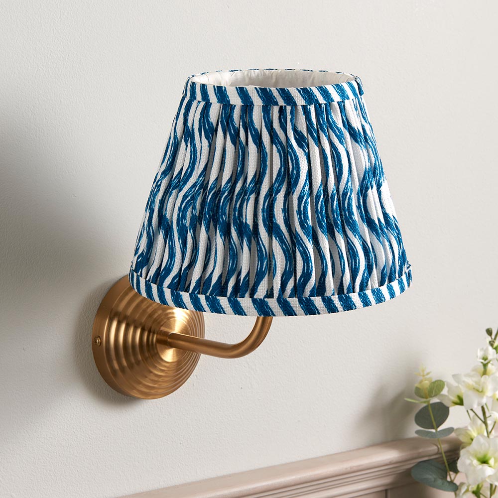 A multiple stepped wall light with a simple curve arm, finished in brushed aged brass. Paired with our vibrant marlin blue 20cm Ripple shade for a classic look.