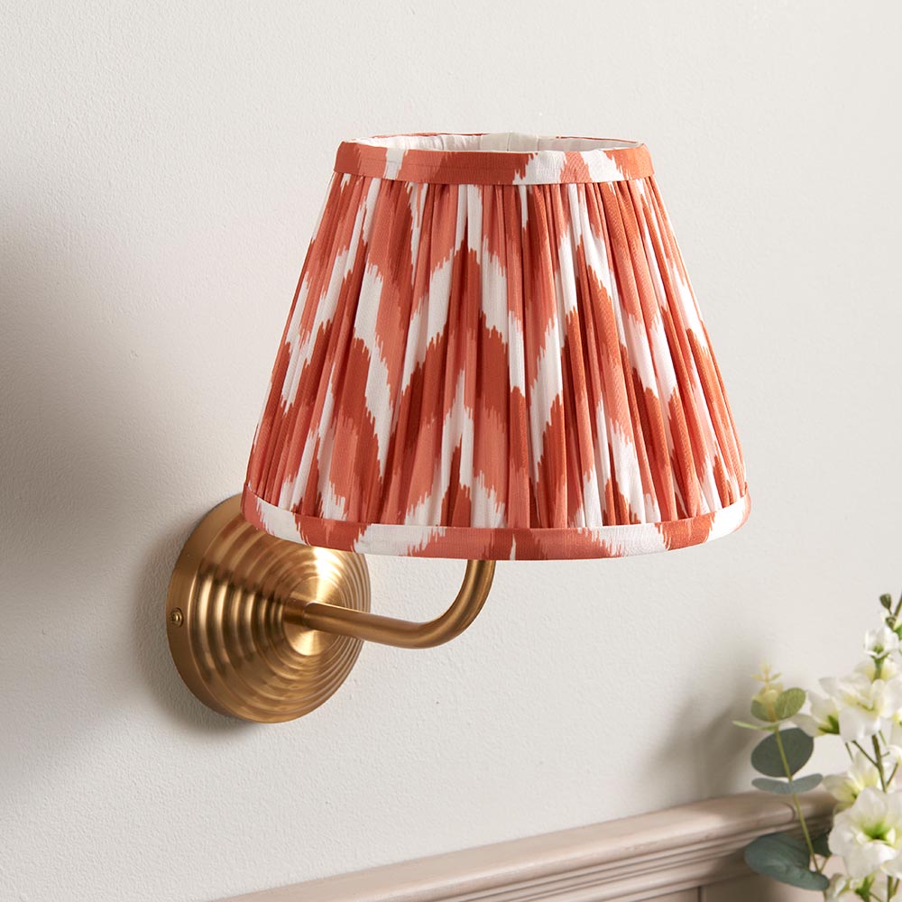 A multiple stepped wall light with a simple curve arm, finished in brushed aged brass. Paired with our bright apricot orange 20cm Zigzag shade for a classic look.
