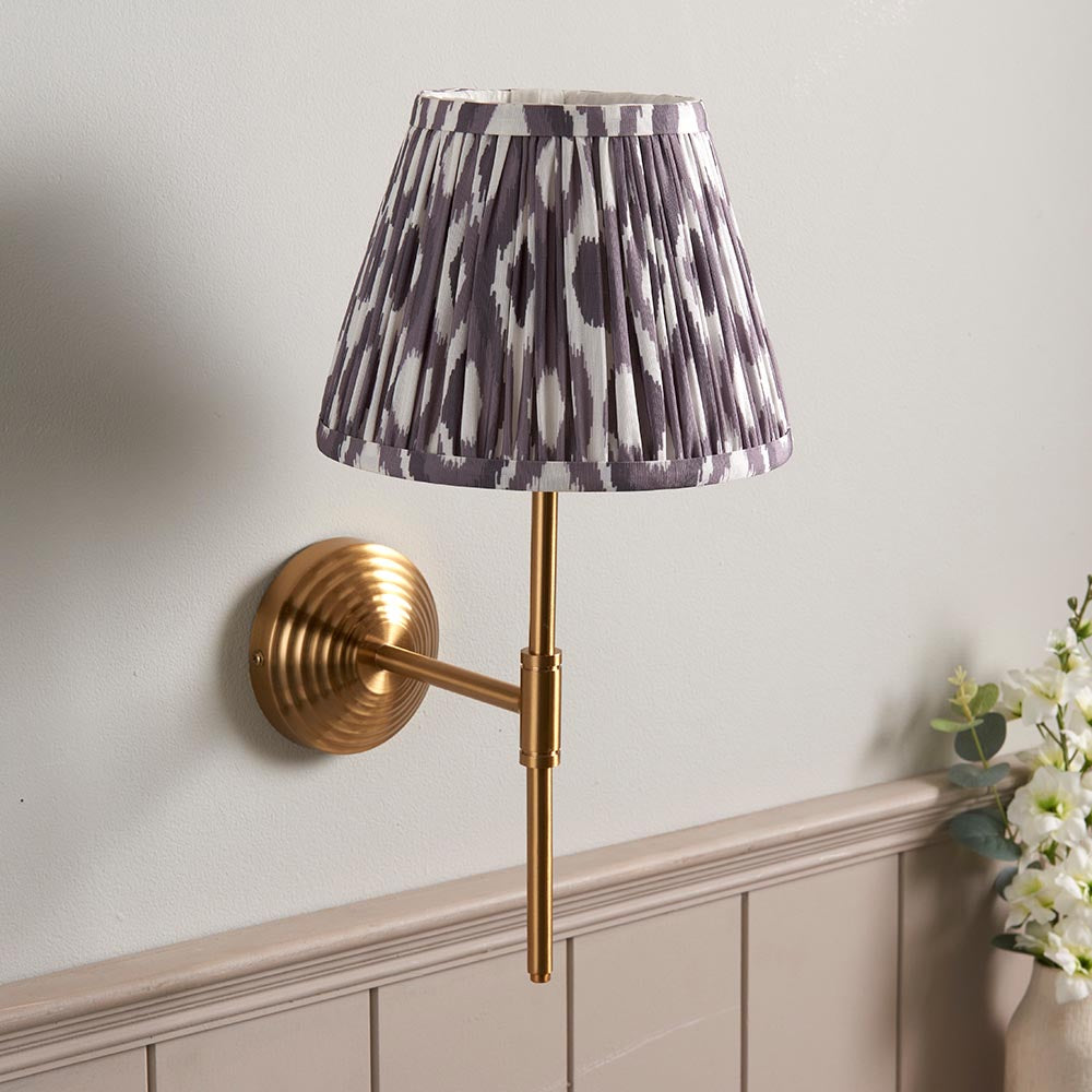 A multiple stepped wall light with an understated T shape arm. Perfect for many areas of your home, finished in brushed aged brass; completed with our stylish pearl grey 20cm Ikat shade for a classic look.