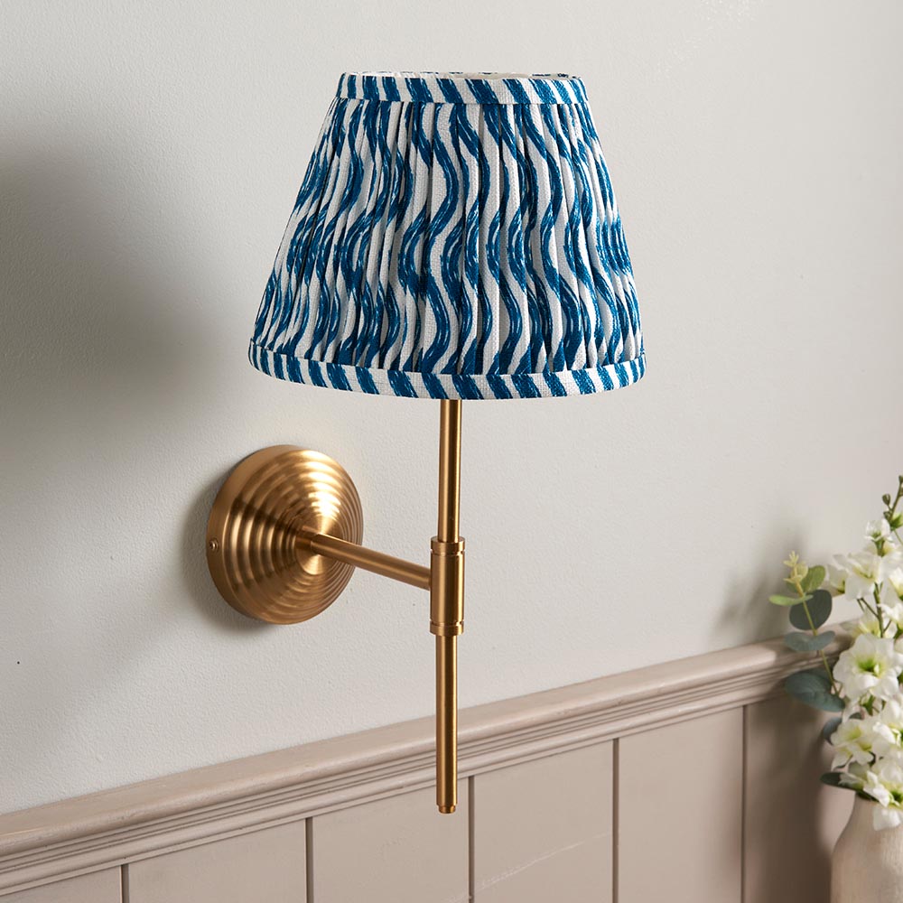 A multiple stepped wall light with an understated T shape arm. Perfect for many areas of your home, finished in brushed aged brass; completed with our vibrant marlin blue 20cm Ripple shade for a classic look.