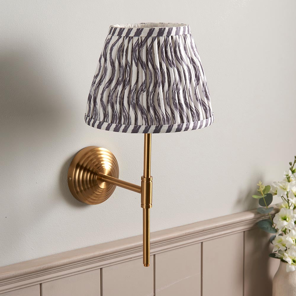 A multiple stepped wall light with an understated T shape arm. Perfect for many areas of your home, finished in brushed aged brass; completed with our stylish pearl grey 20cm Ripple shade for a classic look.